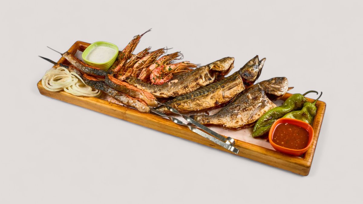 дорадо - 1 шт, сибас - 1 шт, семга - 500 гр, сазан - 1 кг, креветки - 250 гр, мидии в сливочном соусе - 300 гр, овощи на гриле, рис, соус, лук