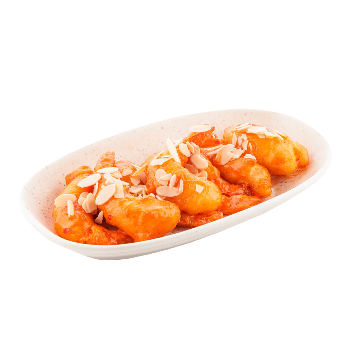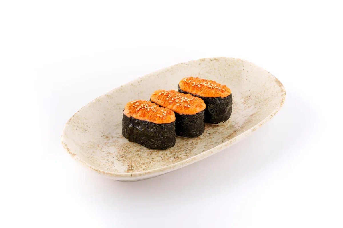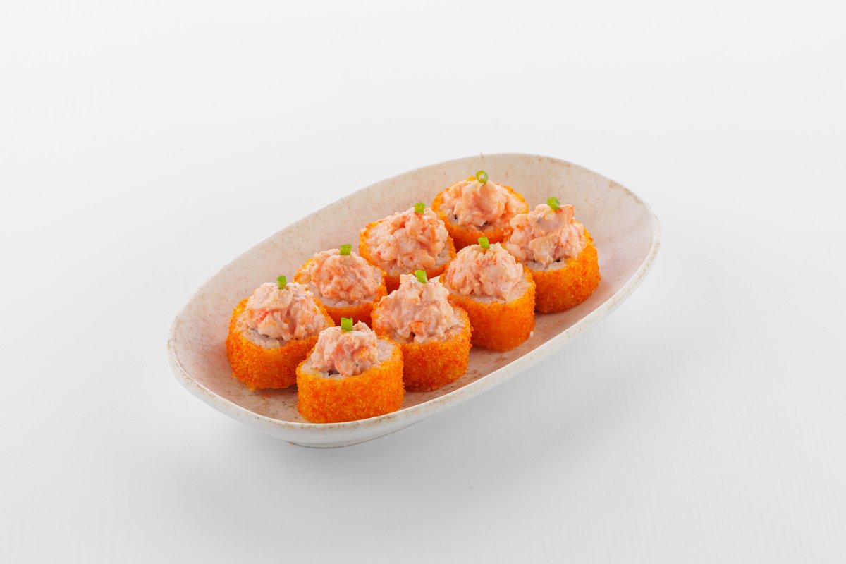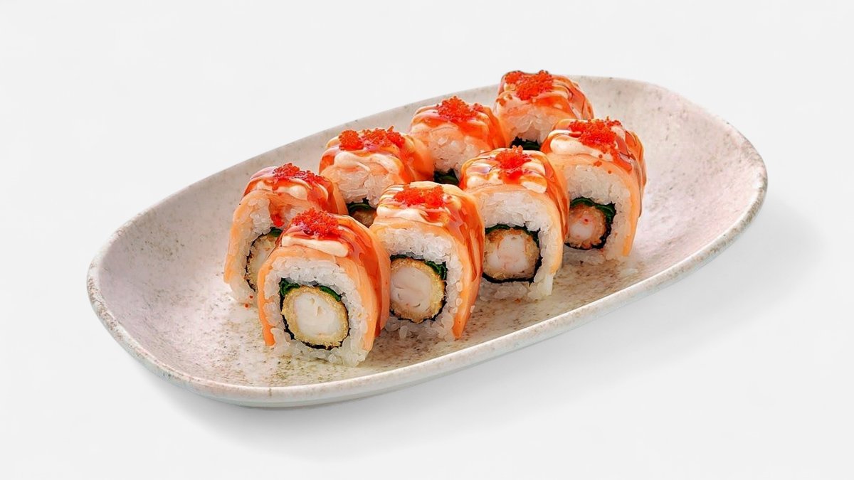 Хрустящий ролл с креветкой и лососем в панко, с пикантными соусами терияки и щрирача, украшенный икрой тобико.