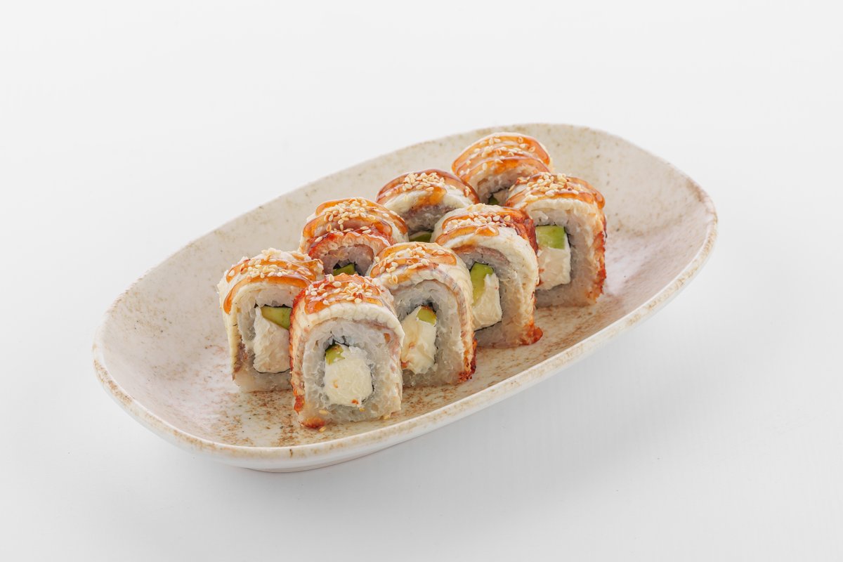 копченный угорь ,сыр сливочный,авокадо,унаги соус,кунжут