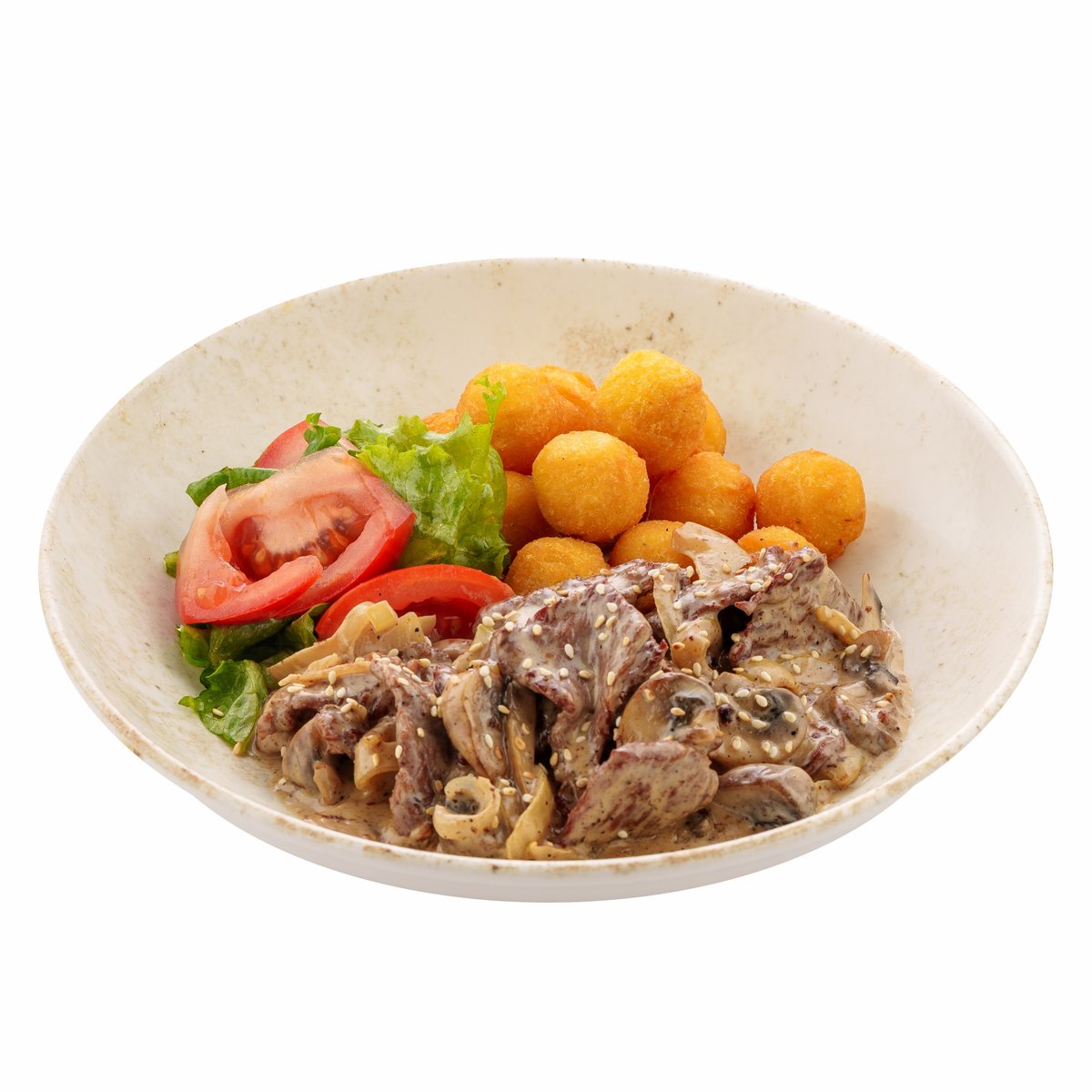 Обжаренные кусочки телятины с лучком и шампиньонами в сливочном соусе с шариками из картофельного пюре в хрустящей панировке