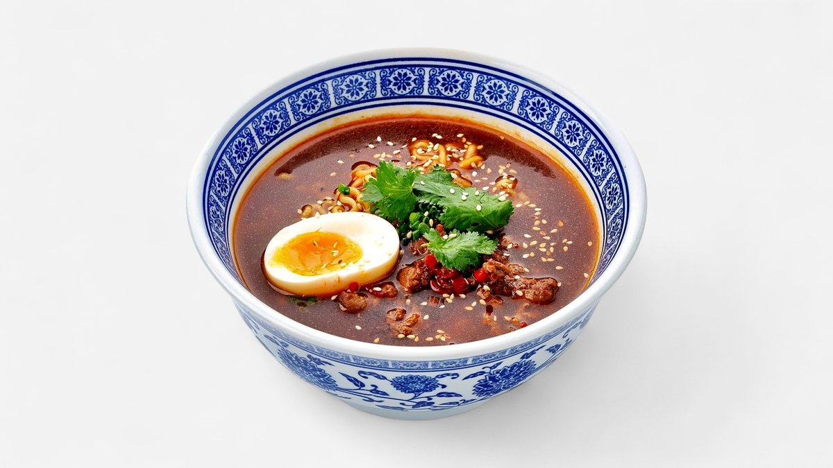 Сытный и пряный корейский суп на курином бульоне с лапшой рамен, обжаренным говяжьим фаршем в ароматных соусах, с половинкой яйца и свежей зеленью.