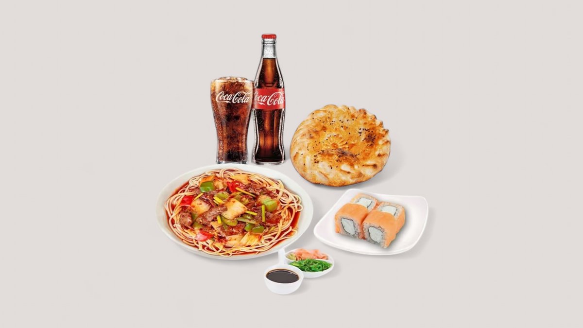 Гуйру лагман, роллы филадельфия 4шт, лепешка пол порции, кола 0.5 (на одну персону)