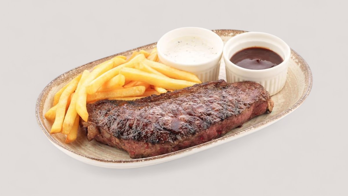 Стейк Нью-Орк- сочный стейк, идеально обжаренный до желаемой степени, с гарниром из хрустящего картофеля фри, подается с ароматными соусами BBQ и белым соусом для насыщенного вкуса.
