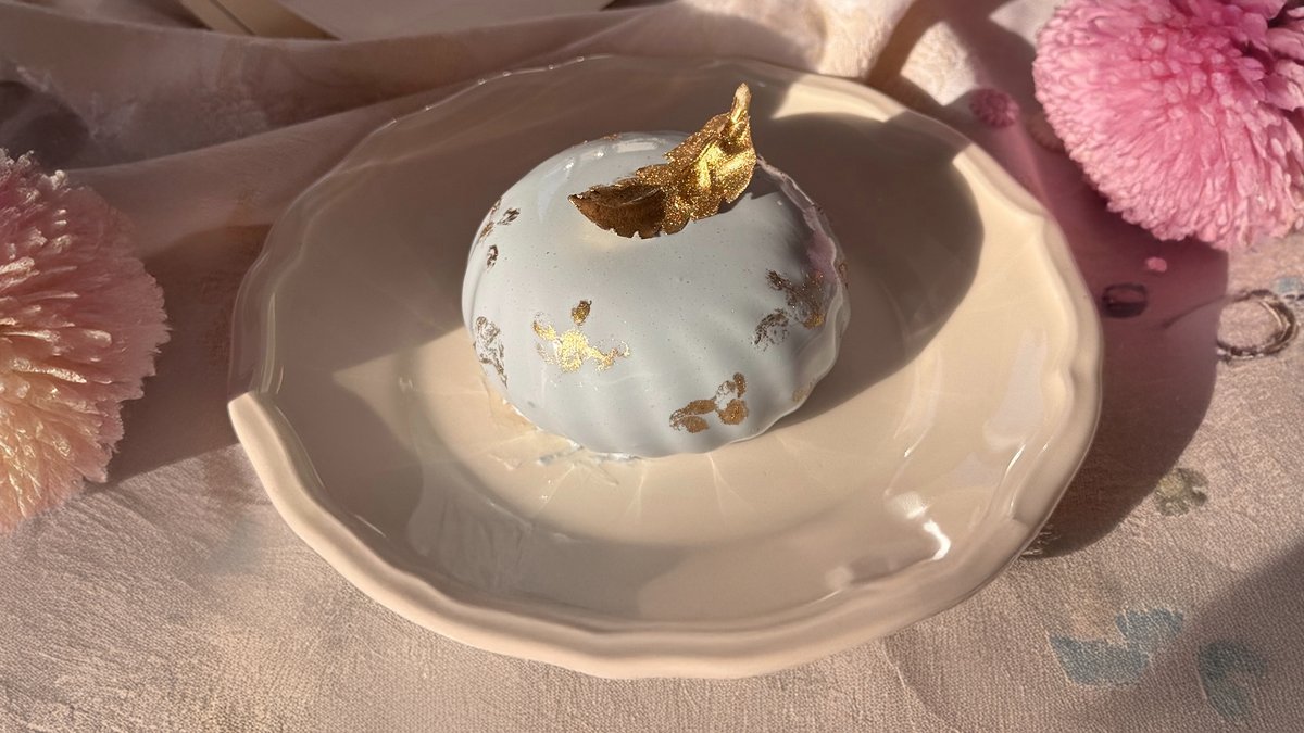 Мусс молочный улун, медовое кремю, бисквит с чаем улун, «ткань» из чая жасмин, шоколадная маска