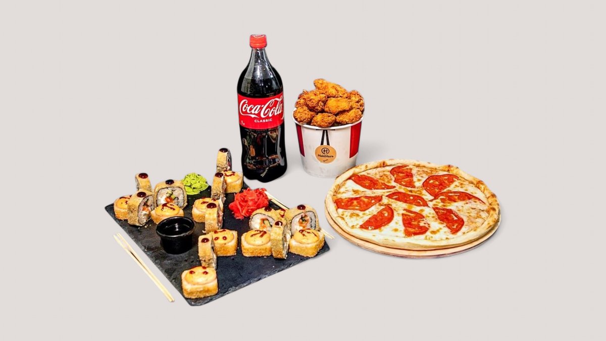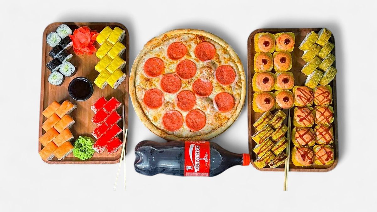 Готовые наборы роллов и пиццы для компании. Удобно делиться и пробовать разные вкусы по выгодной цене