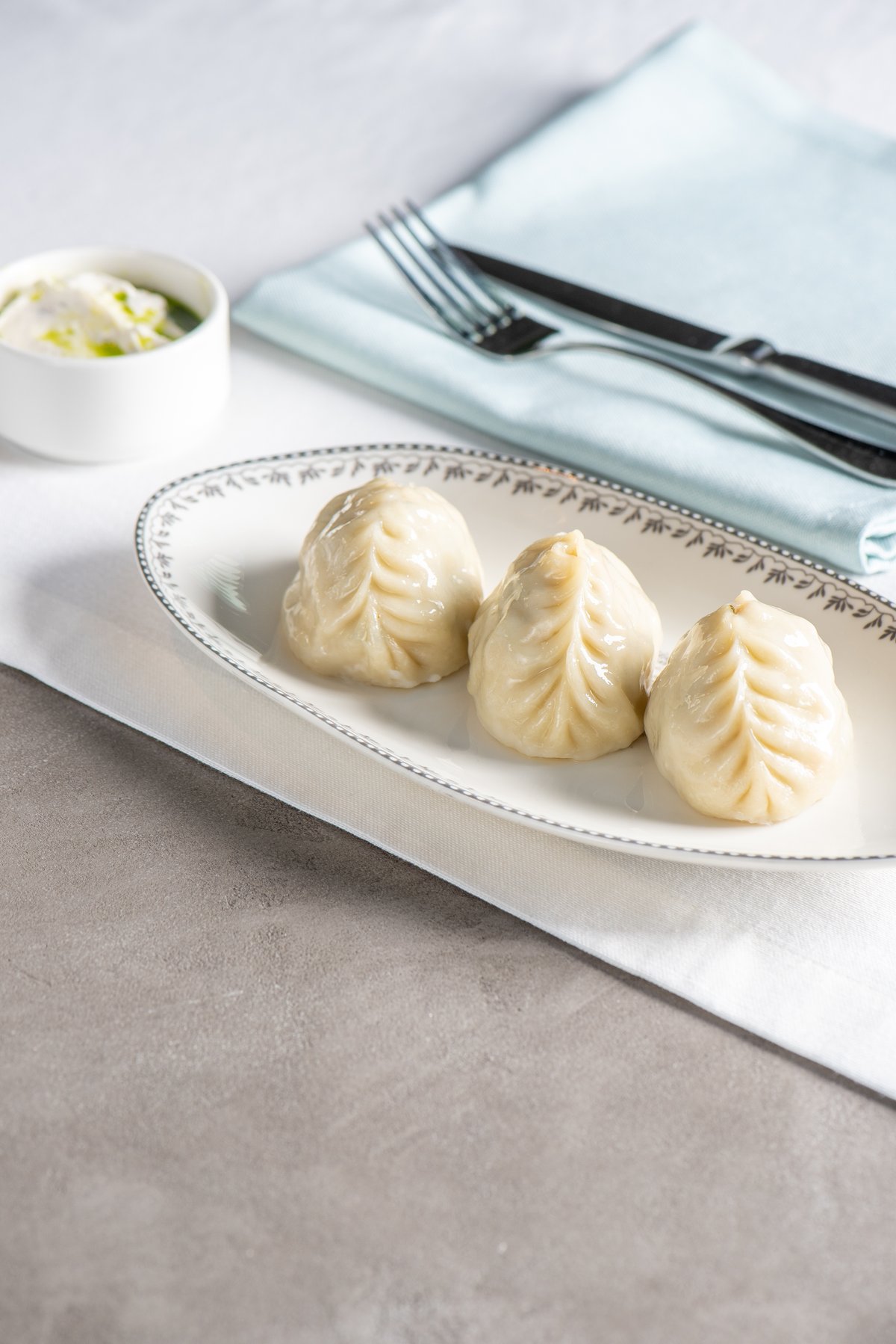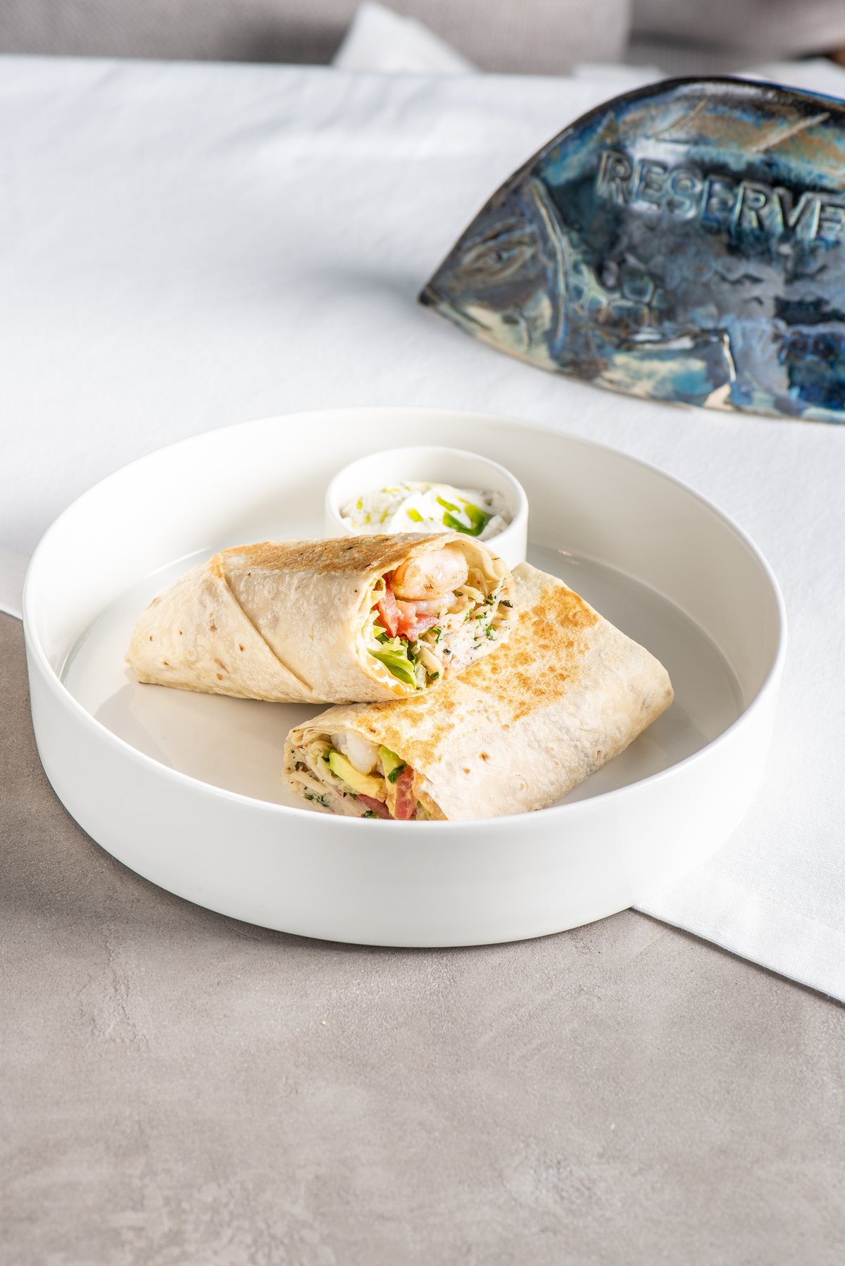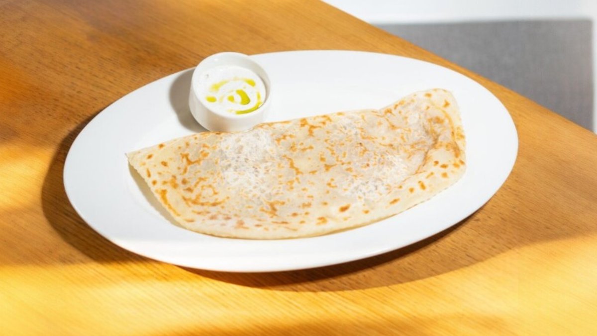 Кутаб с начинкой из краба, маринованных артишоков, сыром страчетелла, бульона, сливочного масла, домашнего майонеза, обжаривается на сливочном масле, подается с трюфельной сметаной.