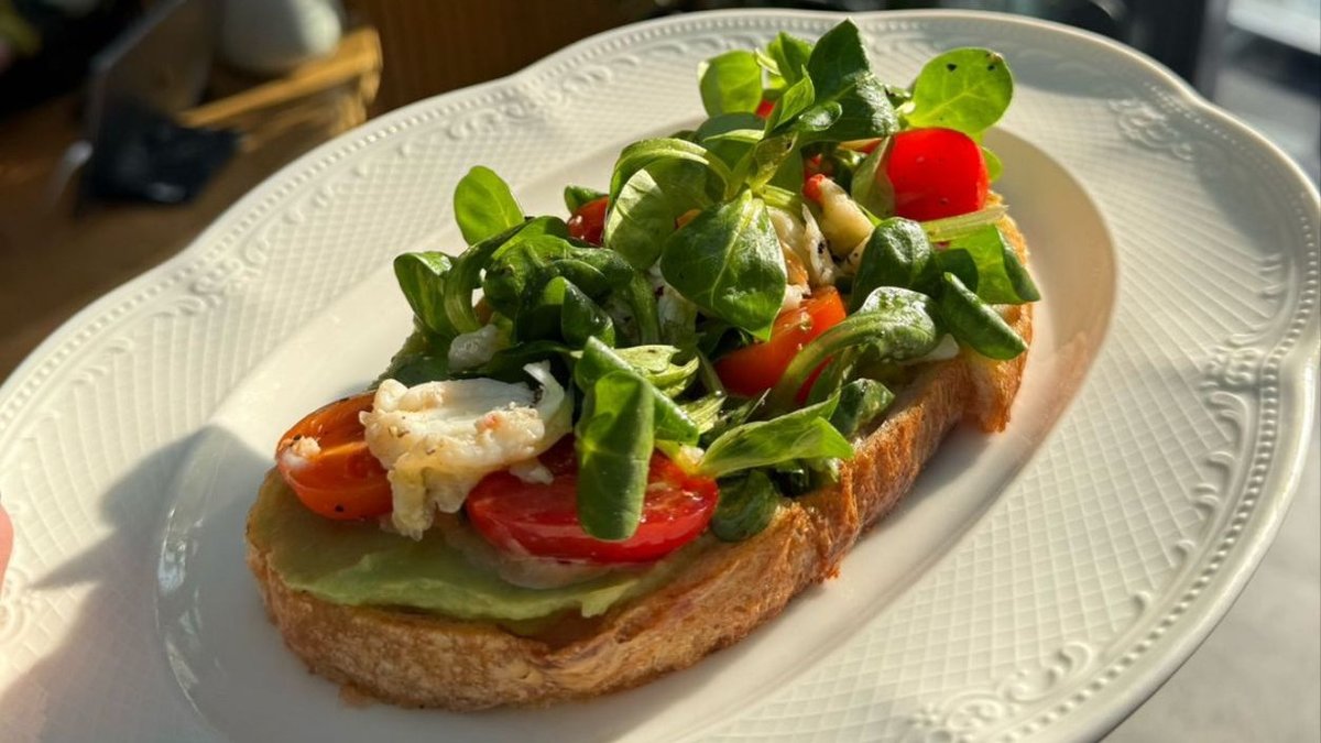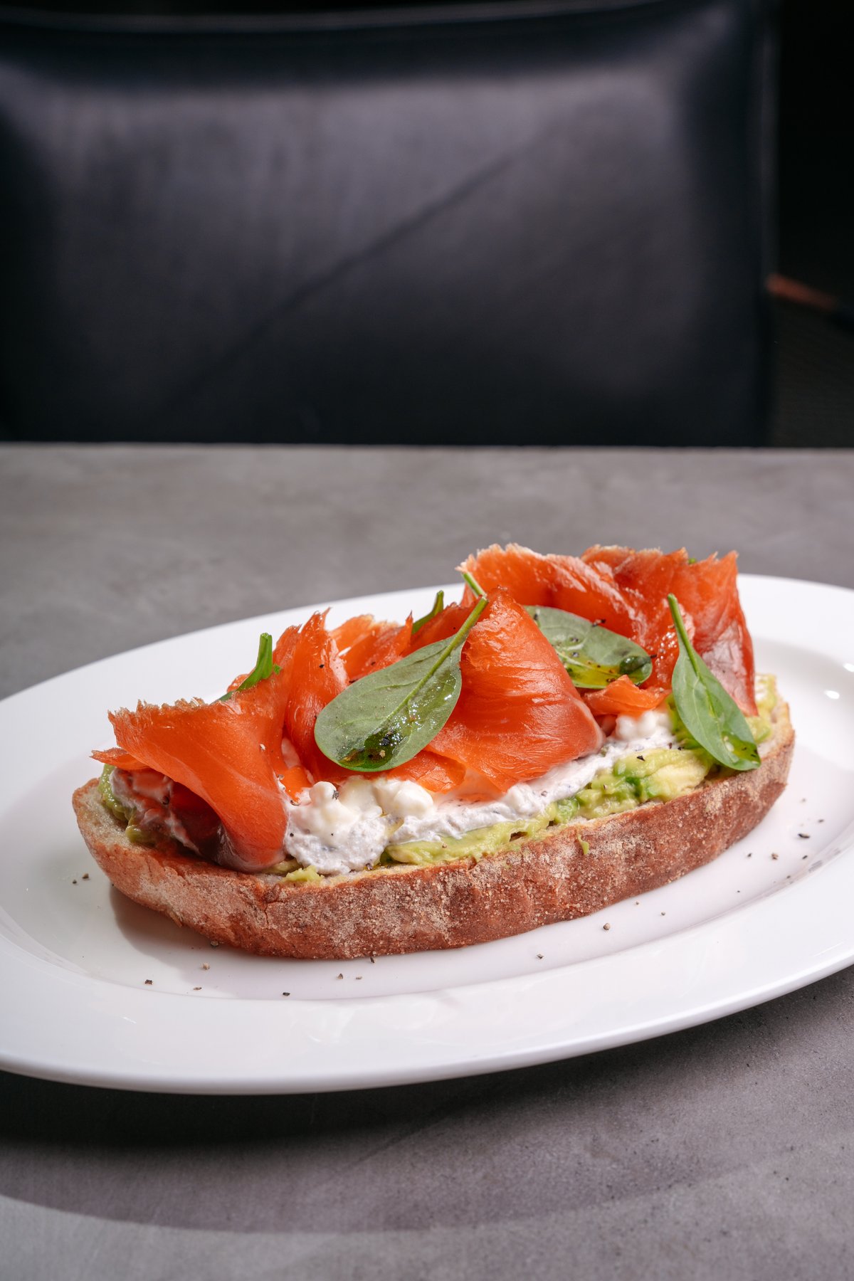 Подовый хлеб, обжаренный на сливочном масле, форель холодного копчения, трюфельная сметана, страчателла, ѓуакамоле, шпинат, салат корн, соль мальдон, черный перец, трюфельное масло