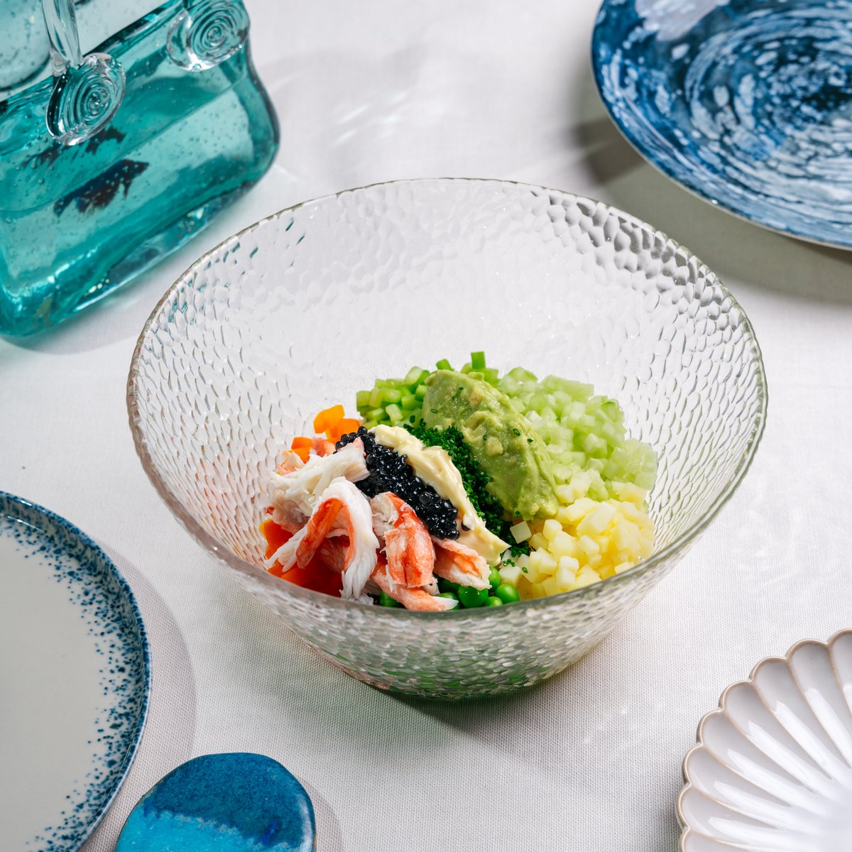 Краб с копченным соусом айоли, гуакомоле, икра палтуса, перепелинное яйцо, домашний майонез, отварные корнеплоды, бланшированная спаржа, свежий огурец