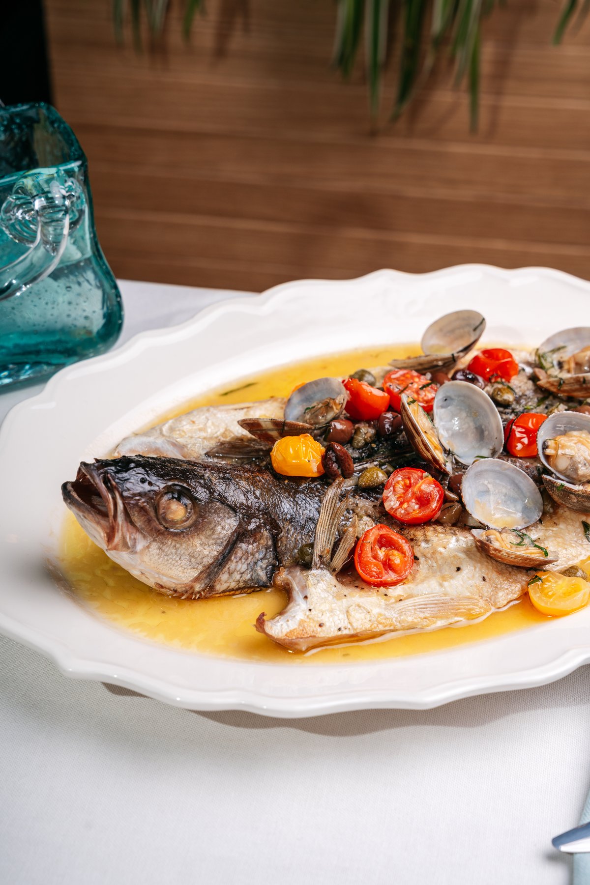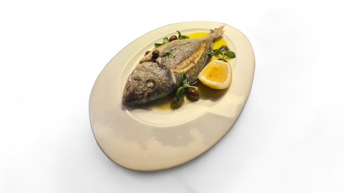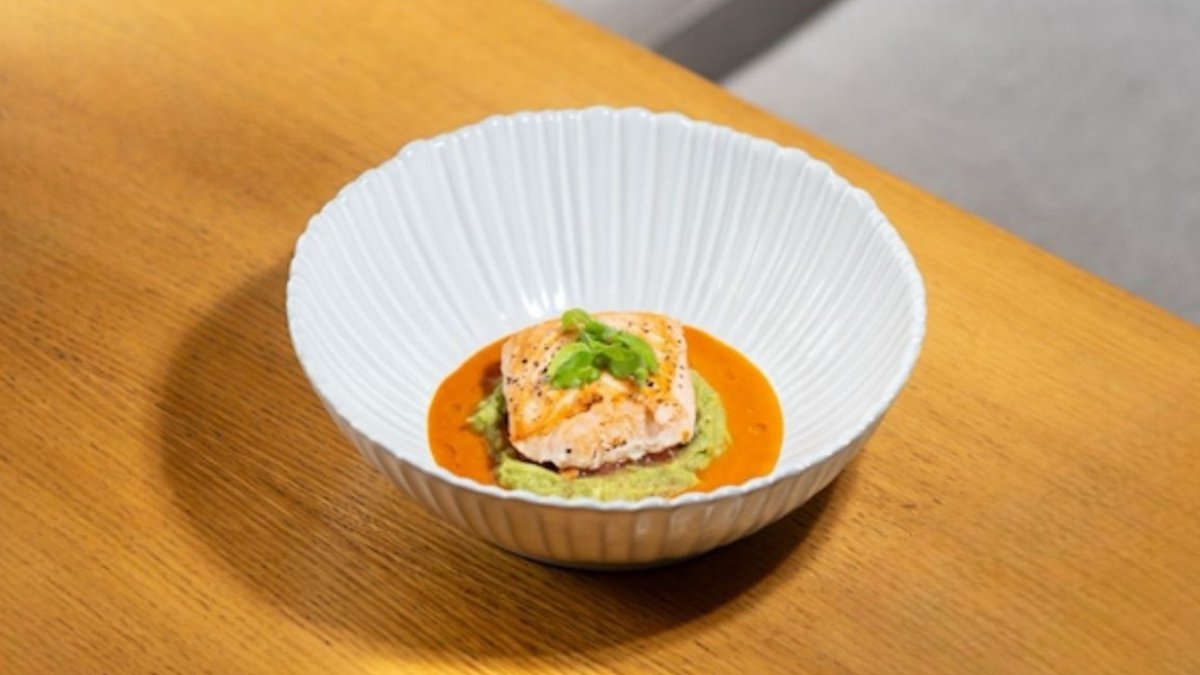 Наваристый рыбный бульон, с северной рыбой, вялеными томатами черри , печенным картофелем. Подается с пучком из листьев петрушки и укропа, поливается трюфельным маслом.
