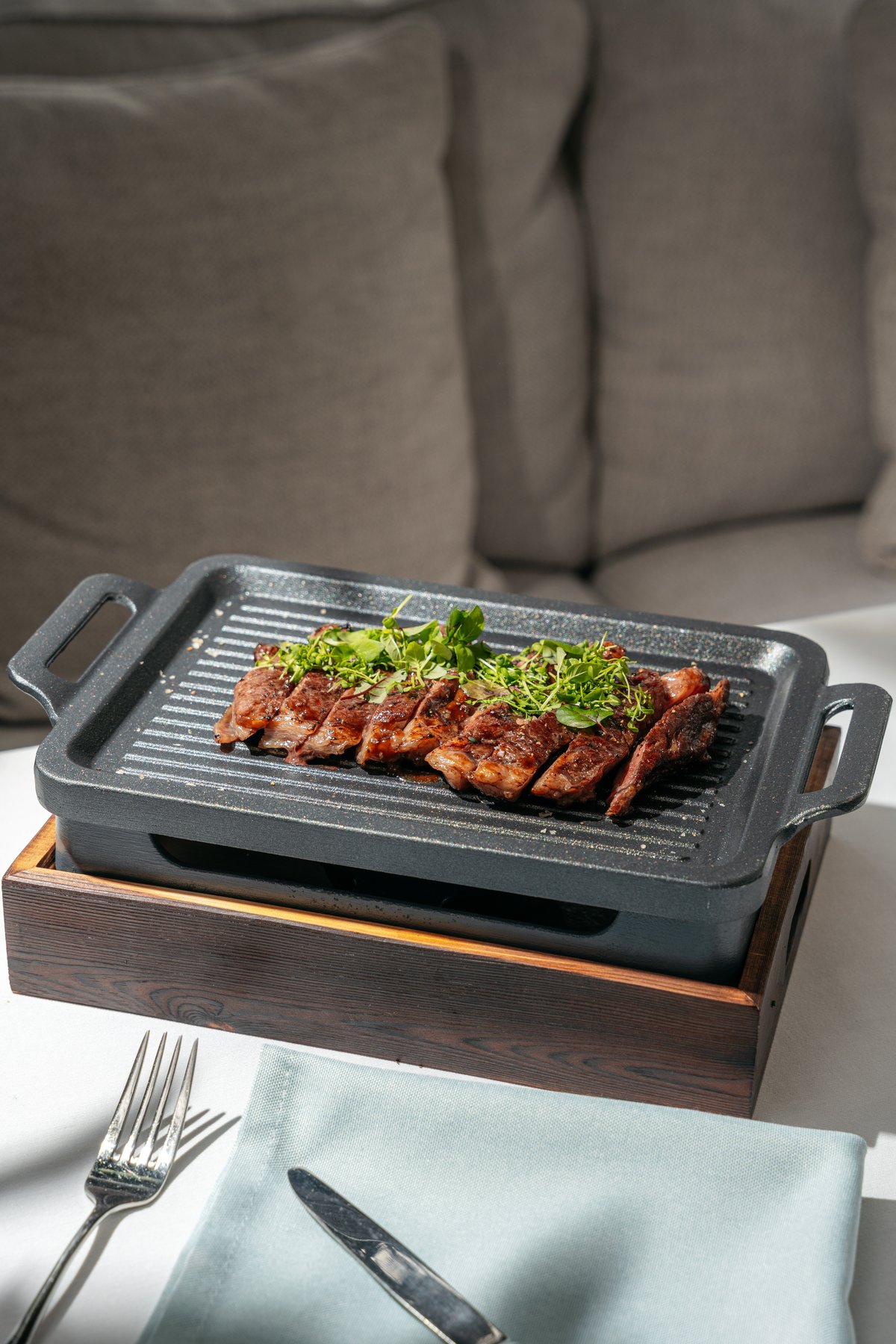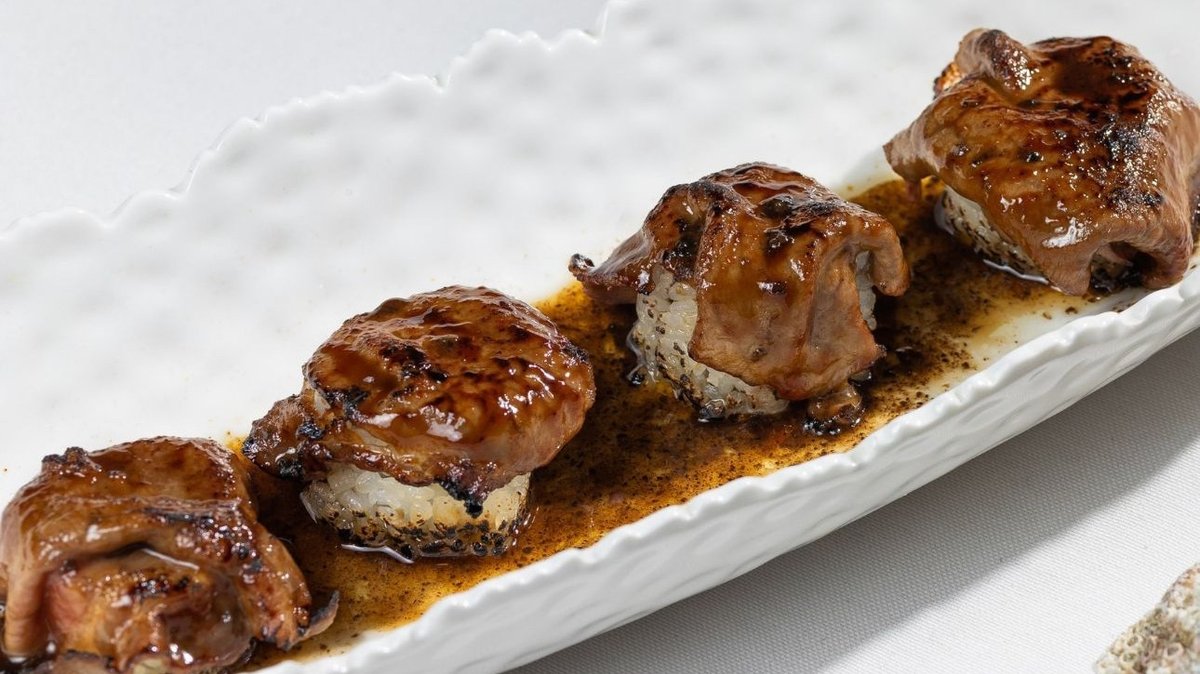 Рибай, маринованный в оливковом масле с тимьяном, обжаривается на топленном сливочном масле, смазывается соусом унагаи, доводится до нужной прожарки в пароконвектомате. При подаче нарезается на некрупные слайсы, посыпается миксом из микрозелени, подается с копченной солью мальдон.