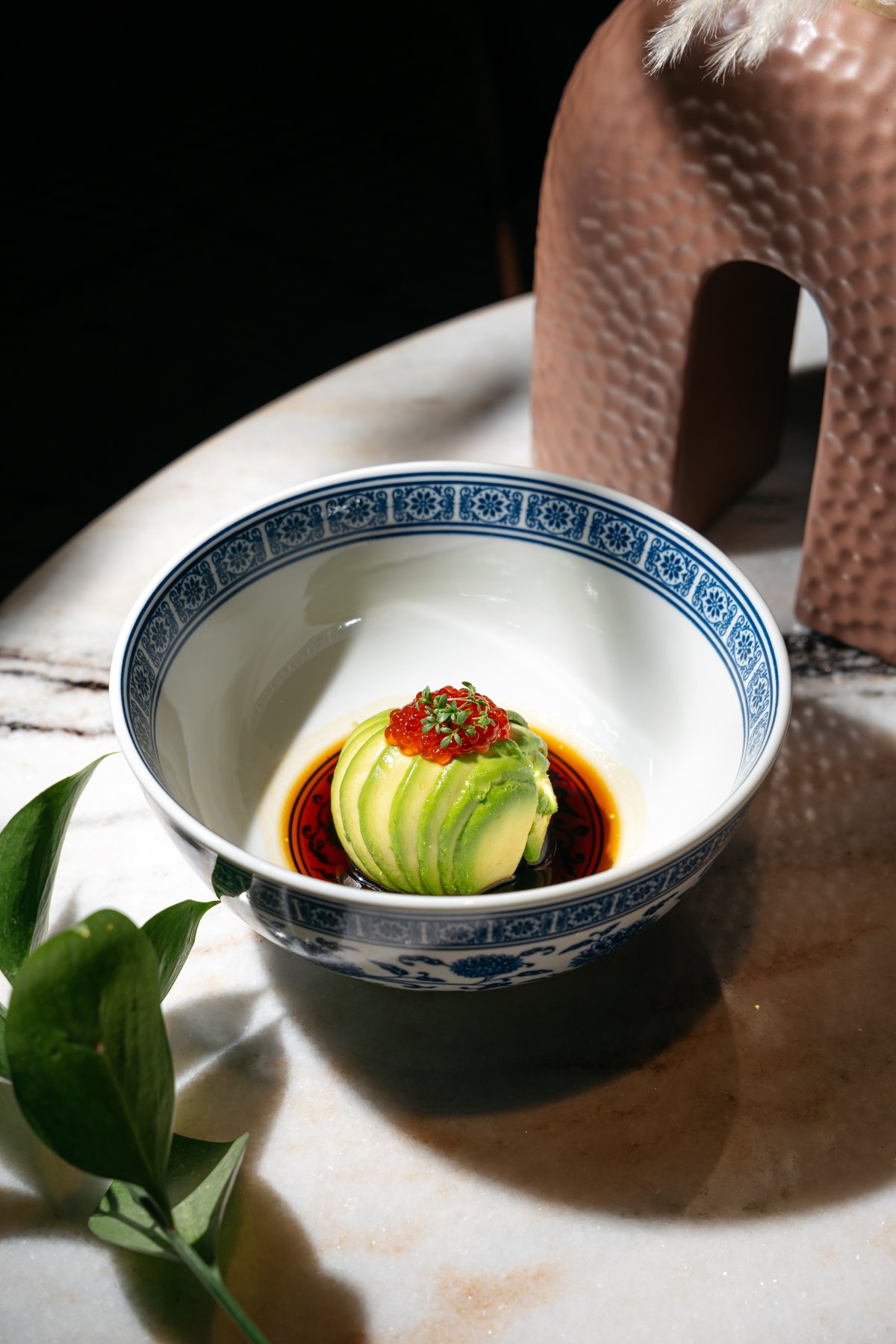 Маринованное мясо камчатского краба в соусе айоли с добавлением икры тобико выкладывается в половину авокадо, далее на краба выкладываем гуакомоле, декорируем икрой палтуса, микро щавелем