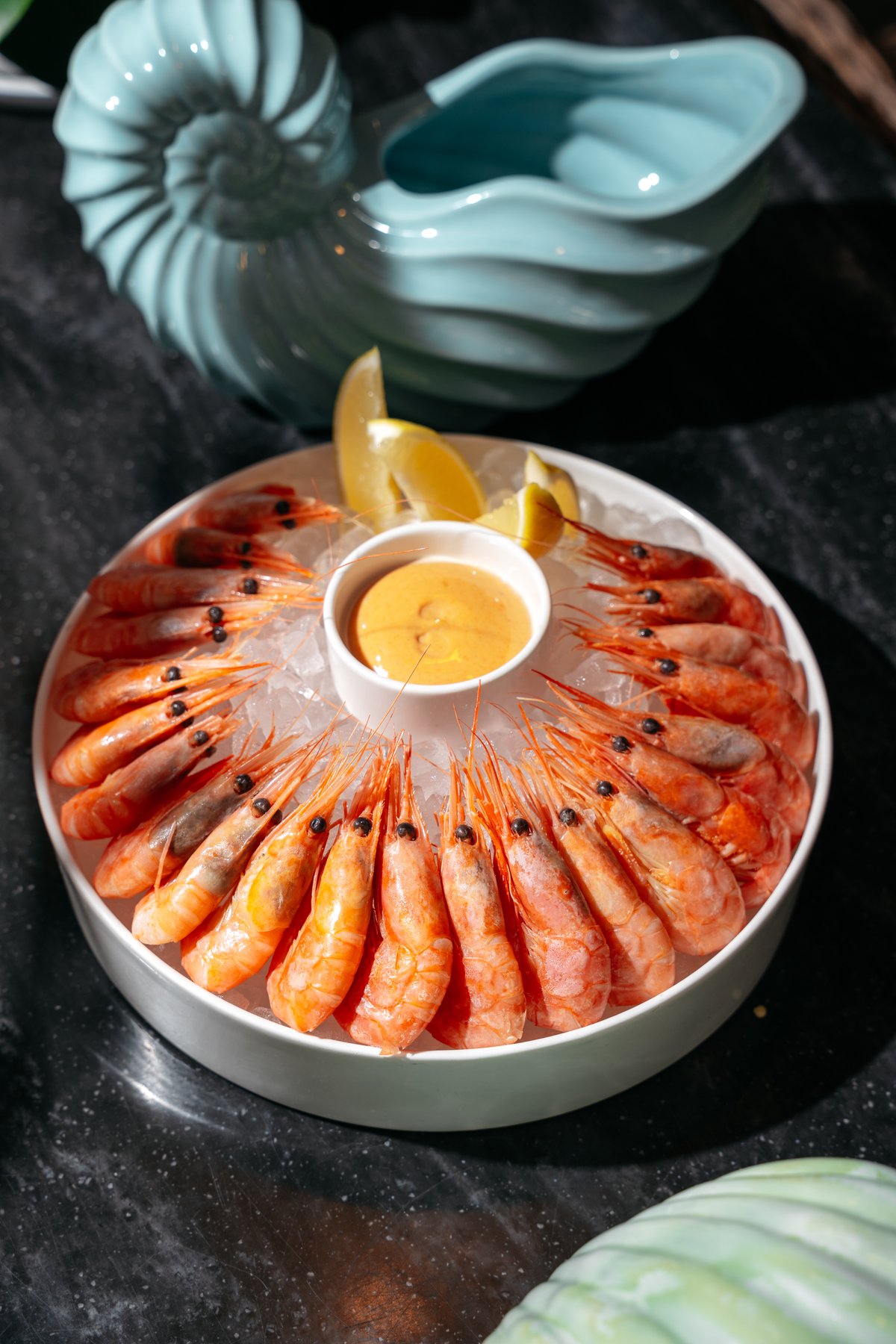 Магаданские креветки подаются от 100гр. Подаются с лимоном и копченным айоли.