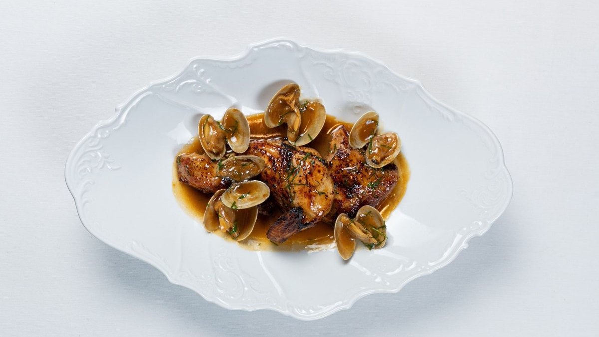 Цыпленок маринуется в паназиатском стиле (Имбирь, мед, чеснок, соус шрирача) запекается в печи до готовности. Подается с соусом "Вонголе" на основе рыбного бульона, соуса "унаги" и сливочного масла.