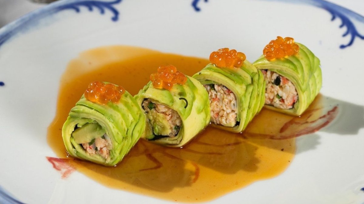 Камчатский краб, перемешивается с соусом айоли, шрирача, луком сибулет. Заворачивается в нори, эта начинка закручивается в тонкие слайсы авокадо, ролл без риса, нарезается на 4 части, украшается красной икрой, подается с соусом медовый шисо ( масло кунжутное, шисо, мед, шрирача). Поливается при госте.