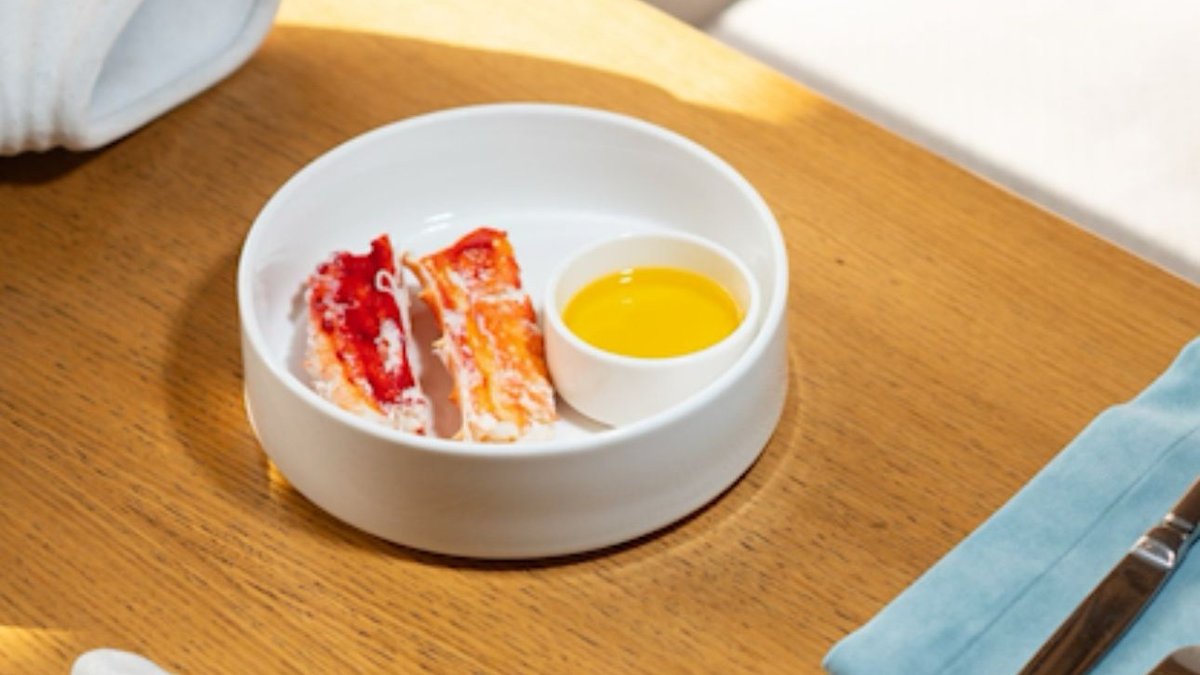 Фаланга краба прогретая в бульоне с сливочным маслом, подается с топленным сливочным маслом.