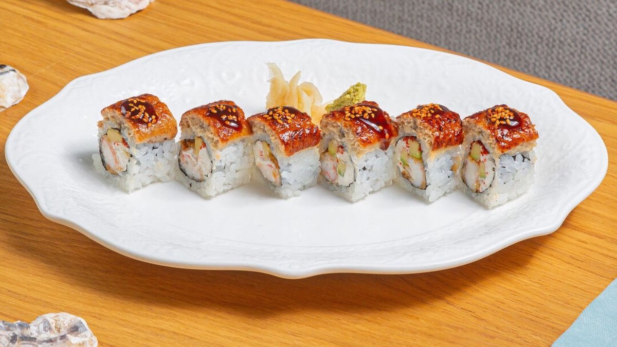 Ролл с креветкой темпура, сыром хондаши, авокадо и икрой тобико с шапкой из ломтиков угря, поливается соусом унаги и кунжутом.