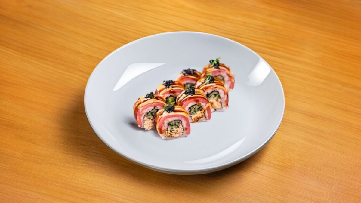 Краб, огурец, слайсы тунца, соус айоли, унаги, икра палтуса, микрозелень