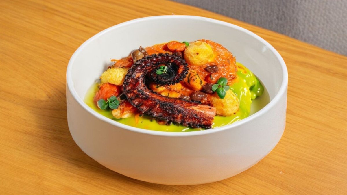 Щупальца осьминога приготовленная по технологии су-вид, томатный соус, каперсы, оливки, молодой обжаренный картофель, листья шпината.