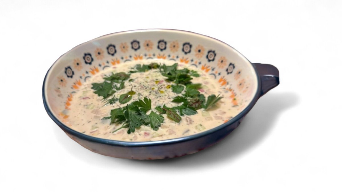 Окрошка приготовленная на тане, со сметаной, айоли и дижонской горчицей. В состав входит отварной картофель, огурец, отварные яйца, редис, лук сибулет, язык .