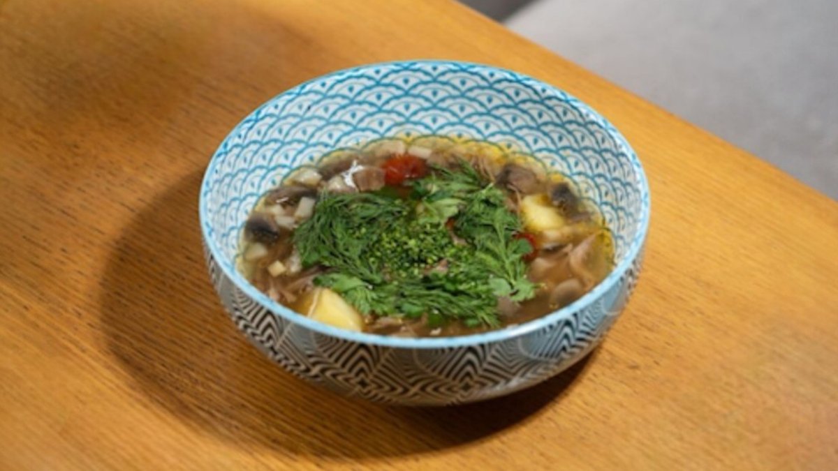 Бульон на говяжьих хвостах с корнеплодами, душистый перец, чили, картофель запеченный, вешенки, шампиньоны, белые грибы, вяленые томаты черри, петрушка, укроп, сибулет