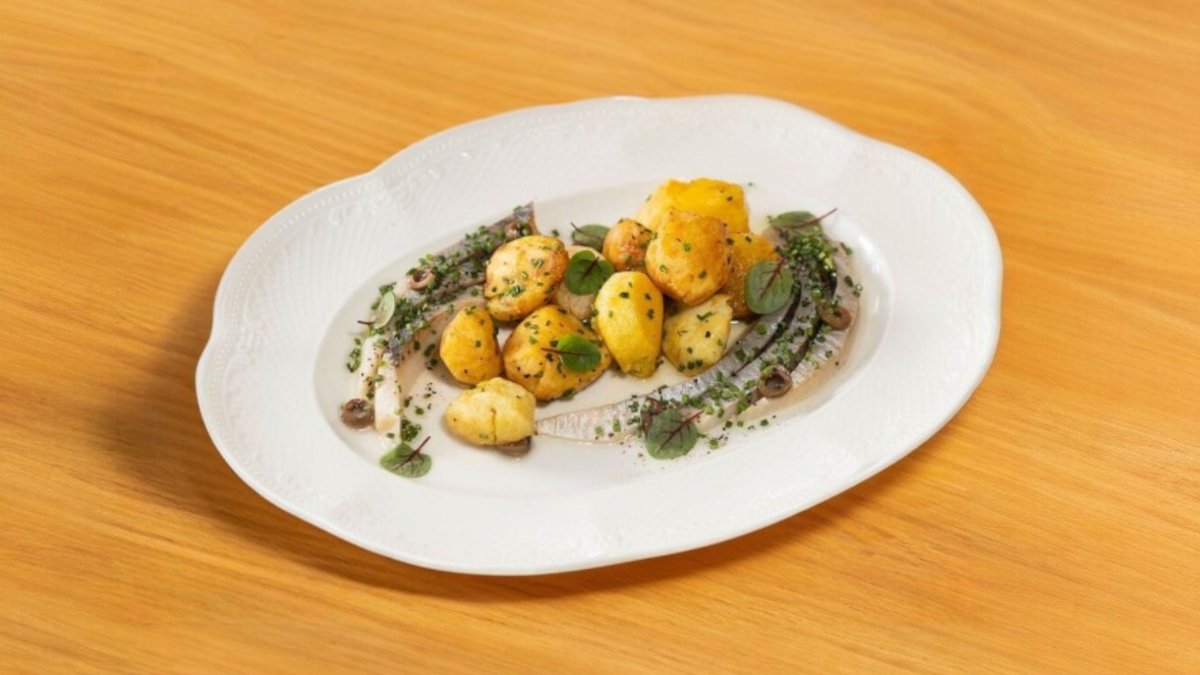 Филе голландской сельди, икра палтуса, таджаские оливки, лук сибулет, оливковое и трюфельное масло, черный перец