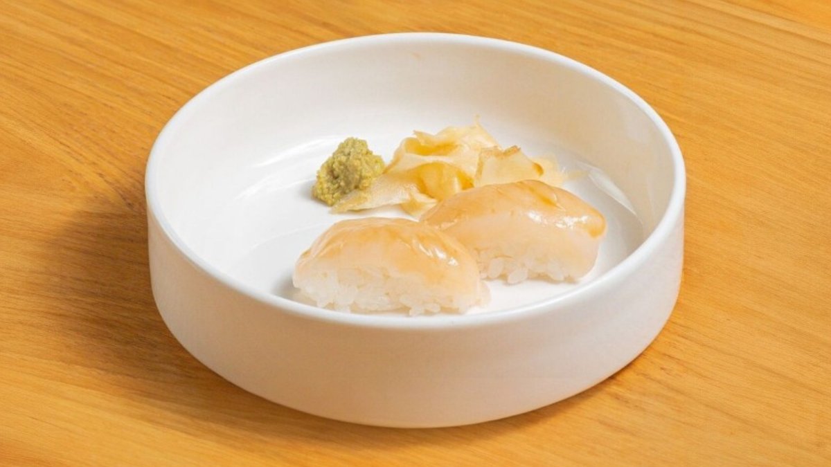 Шарик риса, свежий гребешок, васаби, имбирь