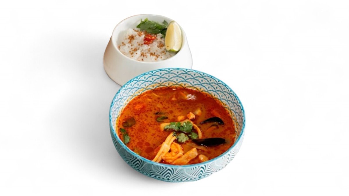 Обжаренные на чили масле коренья, томаты, перец, лемонграсс, галангал, имбирь , тростниковый сахар, паста том ям, готовятся на рыбном бульоне, черри, вешенки, кокосовое молоко, морепродукты, рис жасмин, лайм, чили, кинза