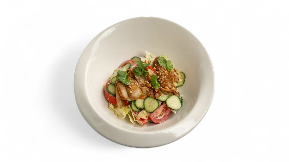 микс салат, помидоры черри, хрустящая курица, кунжут, соус цитрусовый