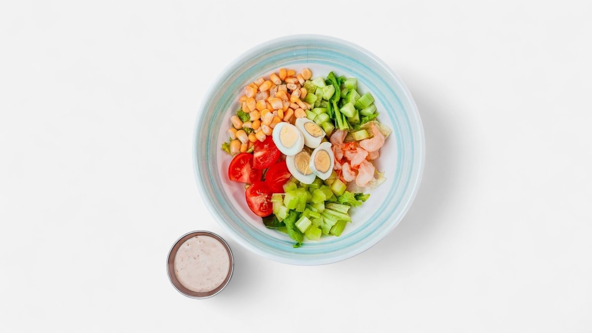 креветки, киноа, эдамаме, сельдерей, огурец, кукуруза, перепелиное яйцо, микс салата, помидоры черри, соус ореховый