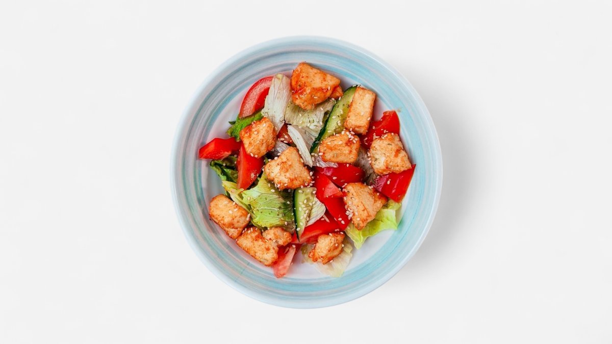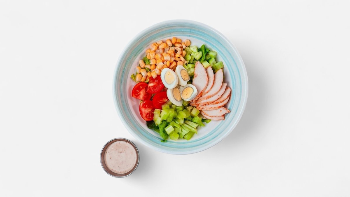 куриная грудка, рис, эдамаме, сельдерей, огурец, кукуруза, перепелиное яйцо, микс салата, помидоры черри, соус ореховый