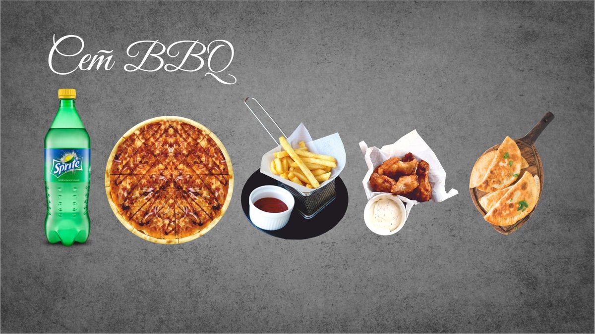 Пицца BBQ, Крылышки BBQ, Картофель Фри, Чебуречки Куриные, Sprite 1л