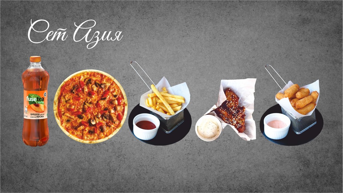 Тайская пицца, Картофель фри, Сырные палочки, Крылышки Терияки, Fuse Tea 1л