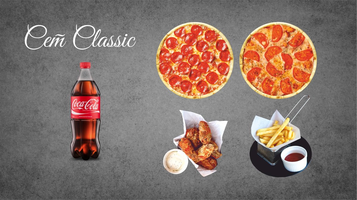 Пепперони, Маргарита, Хрустящие крылышки, Картофель Фри, Coca Cola 1л