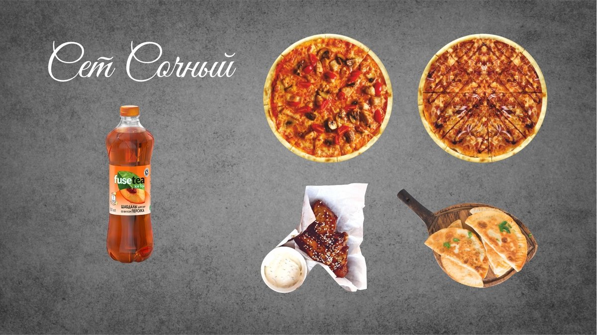 Пепперони, Маргарита, Хачапури по мегрельски, Сырные палочки, Крылышки Хрустящие, Картофель Фри, Куриные стрипсы, Чебуречки куриные, Чебуречки говяжьи, Coca cola 1л, Sprite 1л