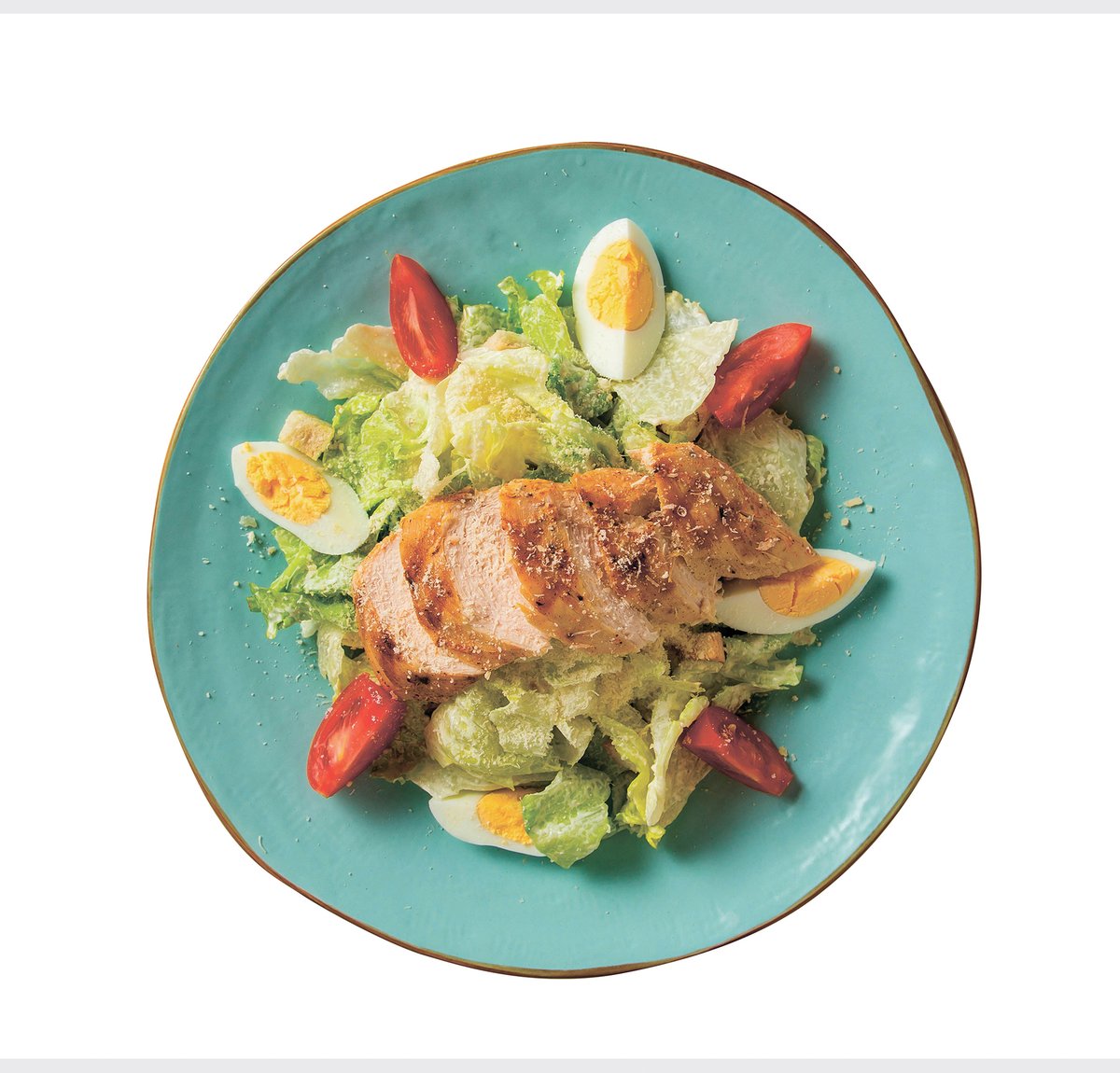 Классический салат из листьев салата Айсберг, с добавлением курицы, помидоров, куриных яиц и чесночных гренок под традиционным соусом Caesar и посыпкой из сыра Пармезан
