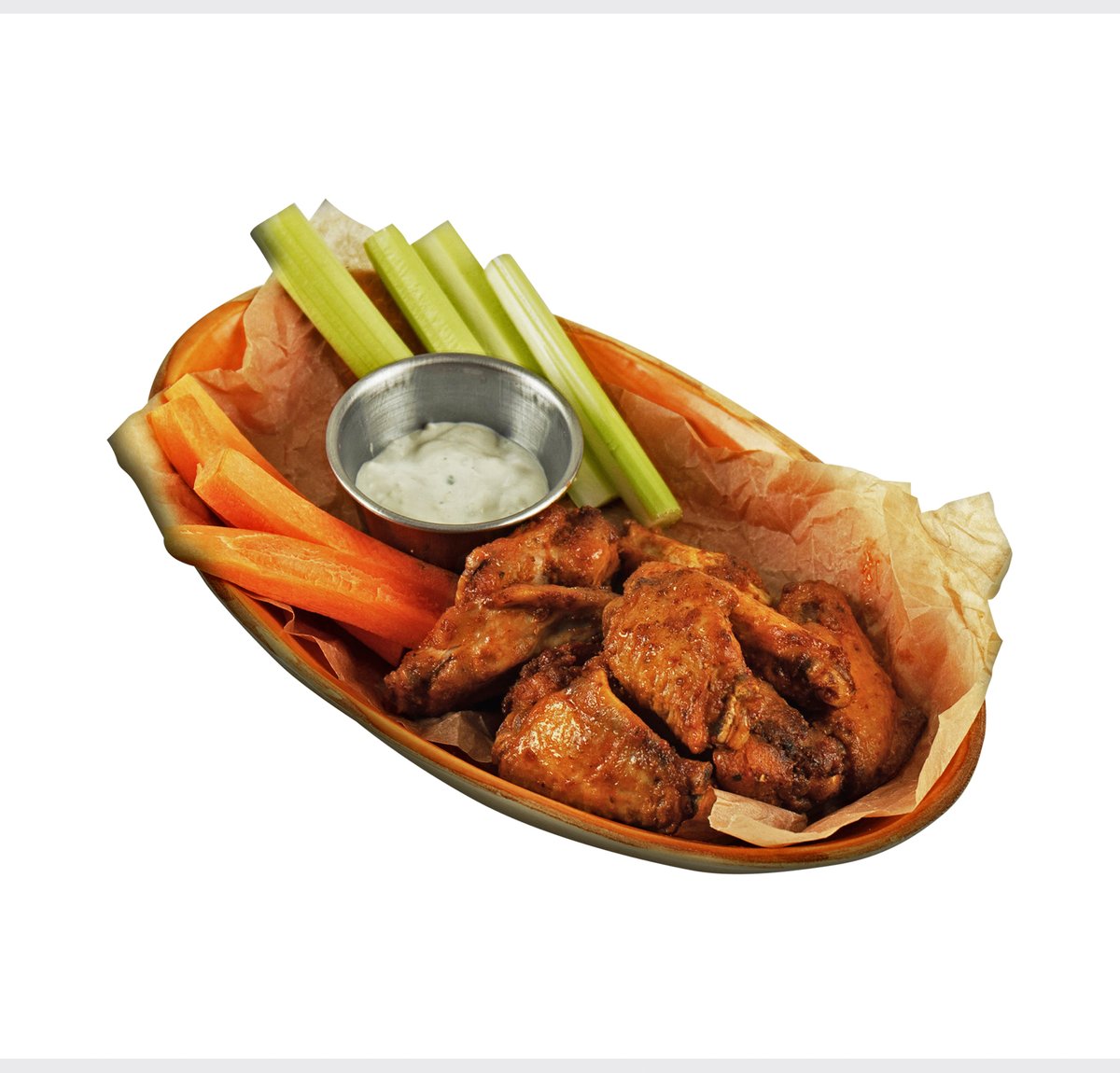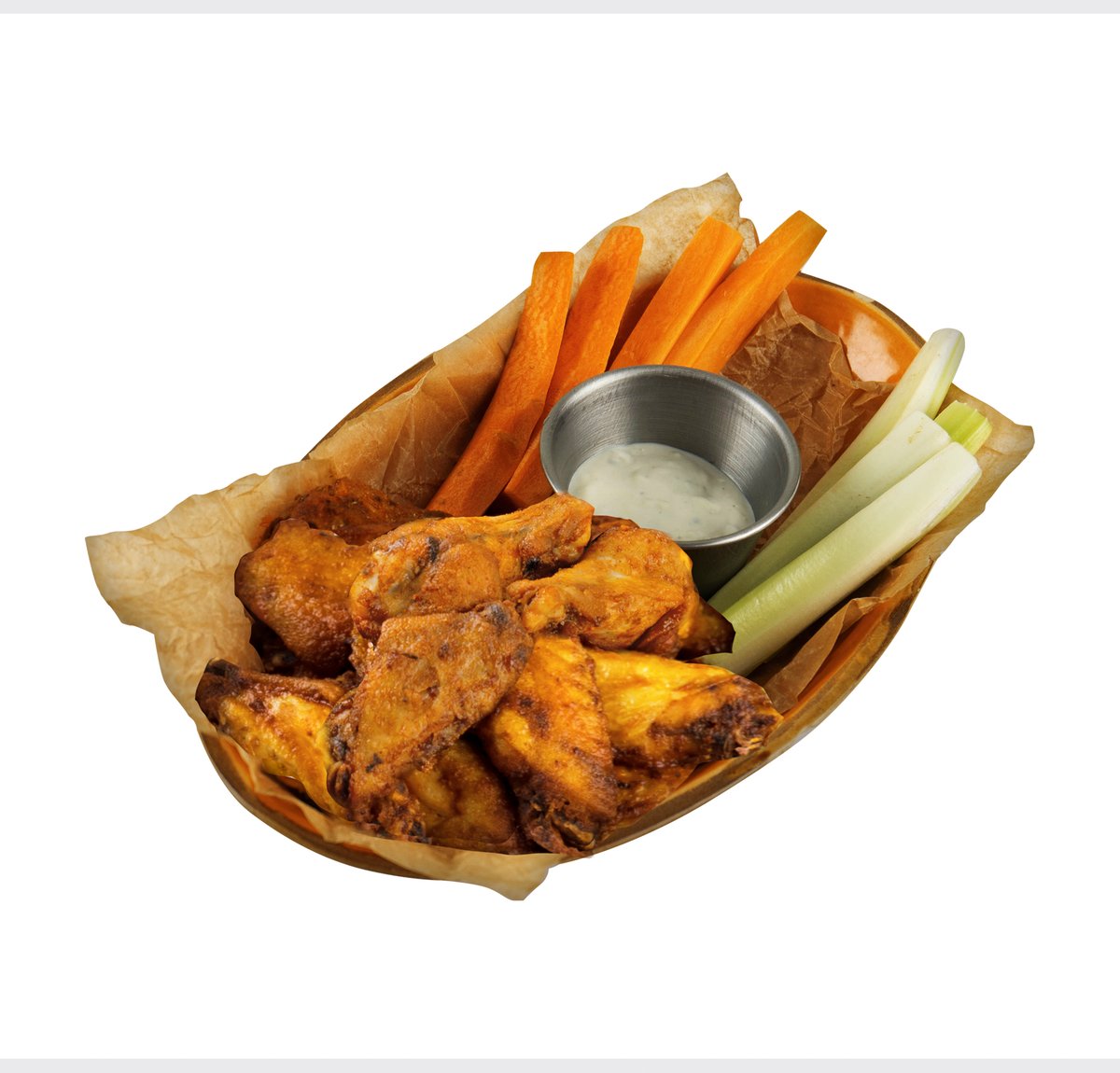 Обжаренные куриные крылья. Подаются с соусами Луизиана, чесночно-майонезный и картофелем фри. Крылья на выбор: острые/не острые