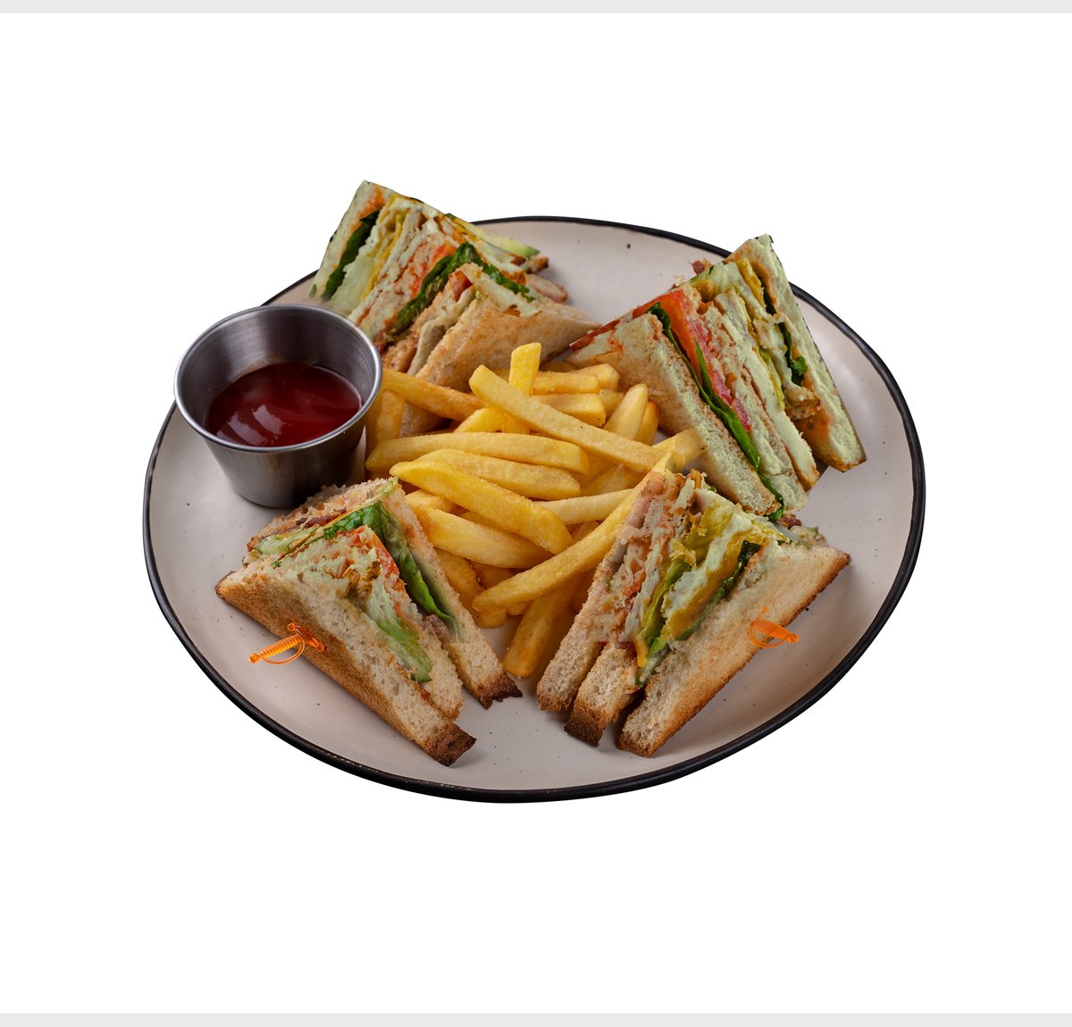 Хрустящие поджаренные тосты с начинкой из курицы, свежих помидоров, сыра Чеддер, жаренного яйца, салата айсберг и соусом тысяча остравов. Подаются с картофелем фри и кетчупом