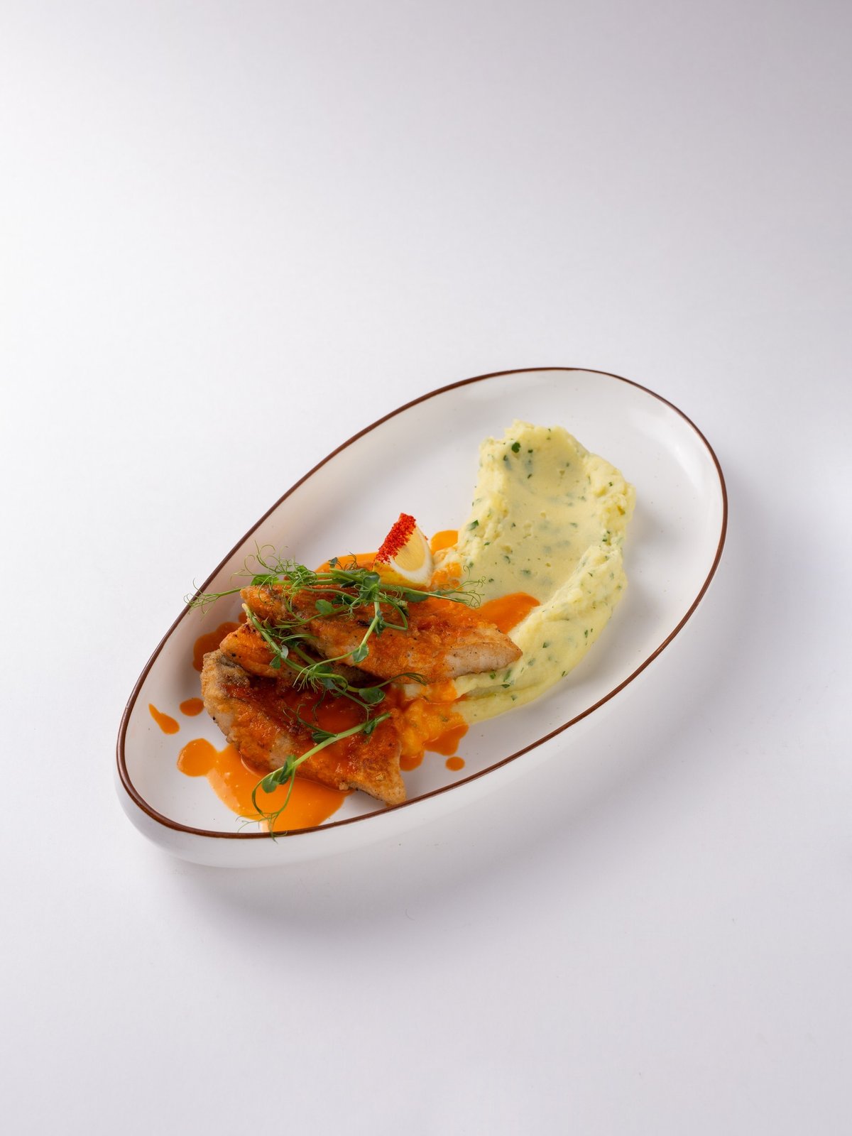 Аппетитный шницель из куриного филе, с салатом из свежих огурцов и помидоров. Подается с Грибным соусом и соусом Матбуха. Украшается микрозеленью и долькой лимона. Гарнир: жаренный картофель