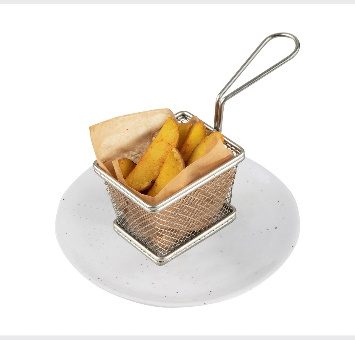 Салат из нежного куриного рулета и копчёных колбасок, хрустящего картофеля, маринованных орцов, томатов черри, листьев салата Айсберг, красного лука и яйца. Заправляется медово-горчичным соусом