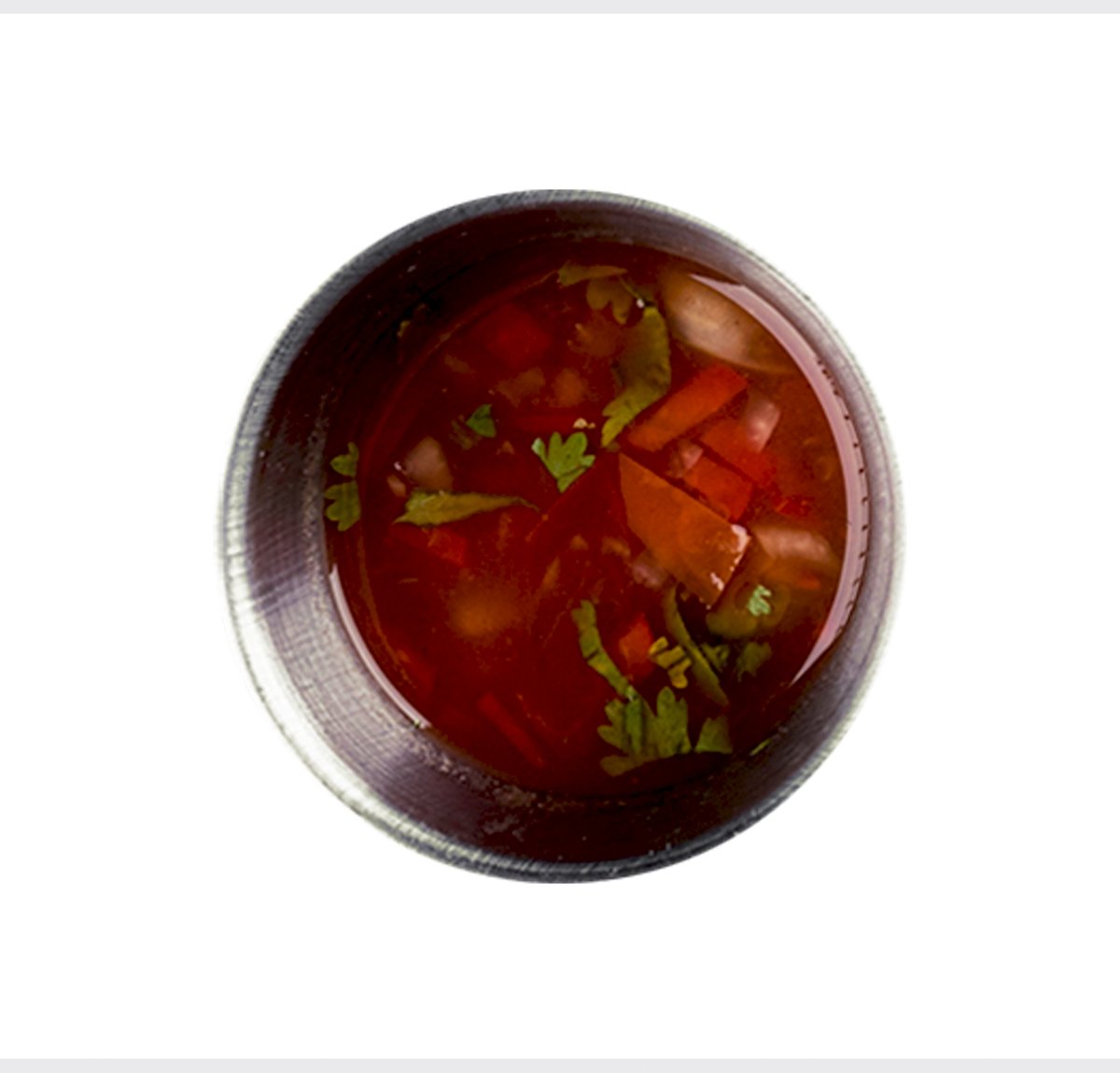 Наваристый бульон на основе баранины с добавлением картофеля, моркови, болгарского перца, помидоров и пряных специй. Украшается свежей зеленью укропа