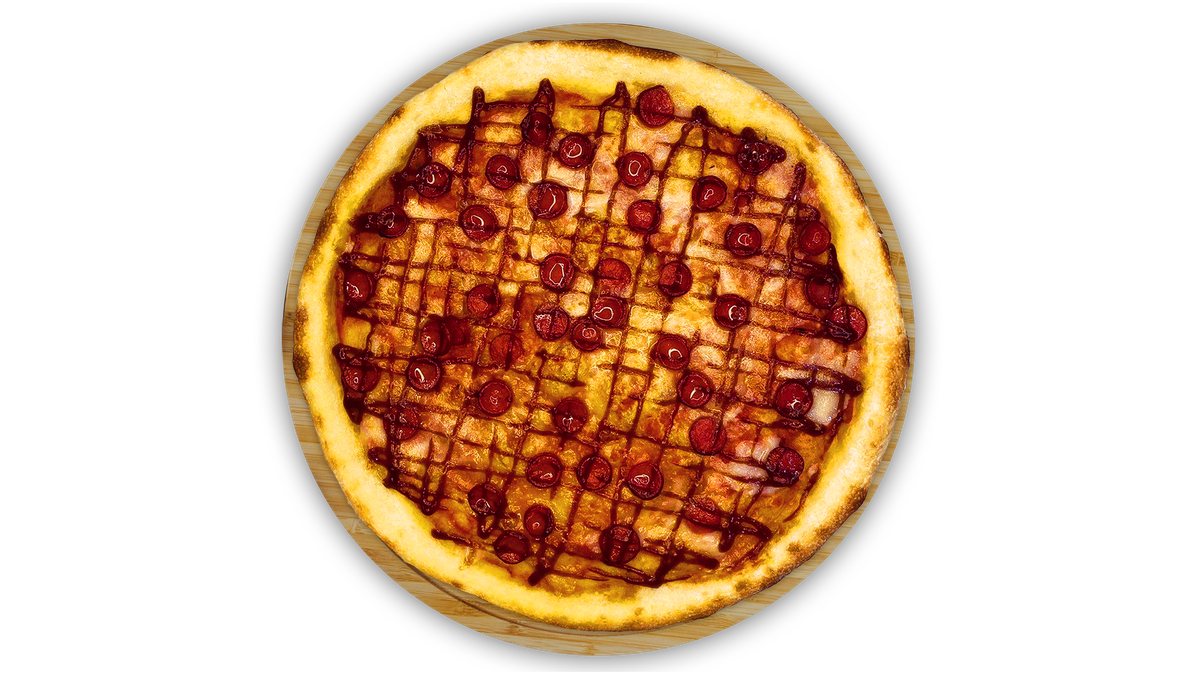 Тесто, моцарелла, фирменный соус , охотничьи колбаски ,красный лук, соус барбекю
