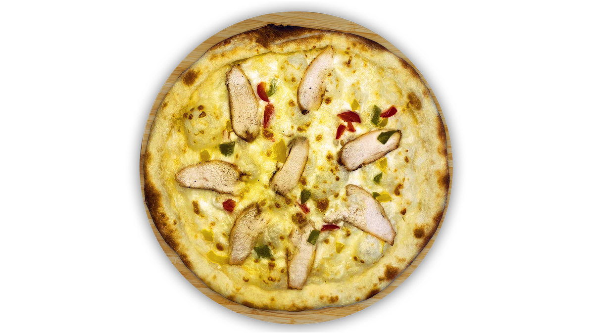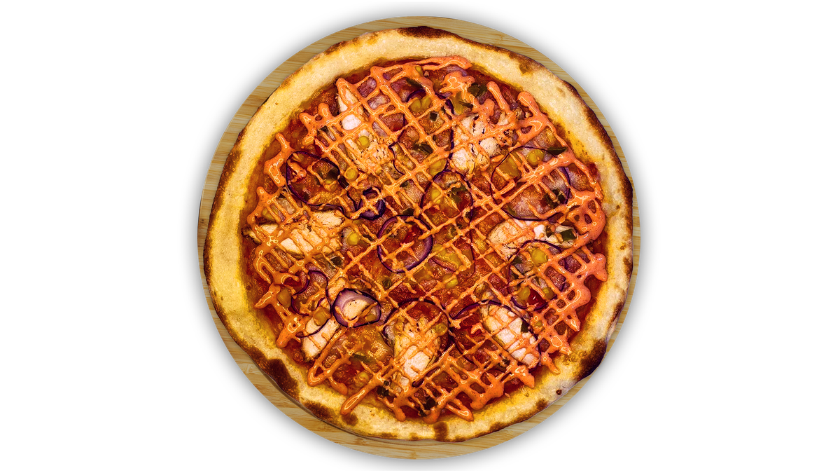 есто, моцарелла, фирменный соус, куриное филе, кукруза, перец светофор , острый соус, красный лук