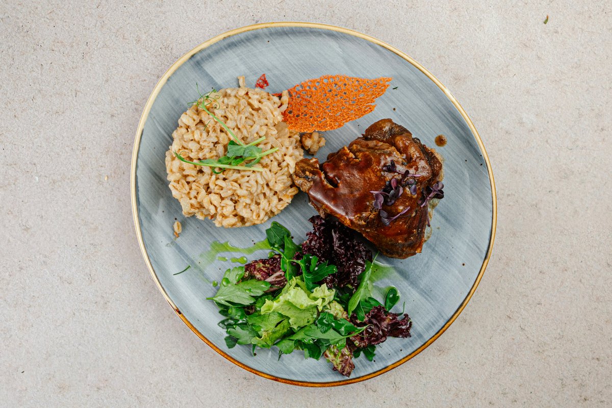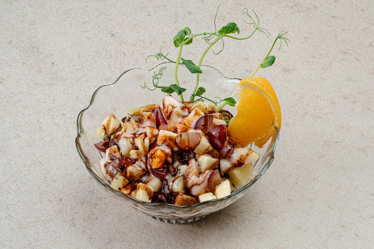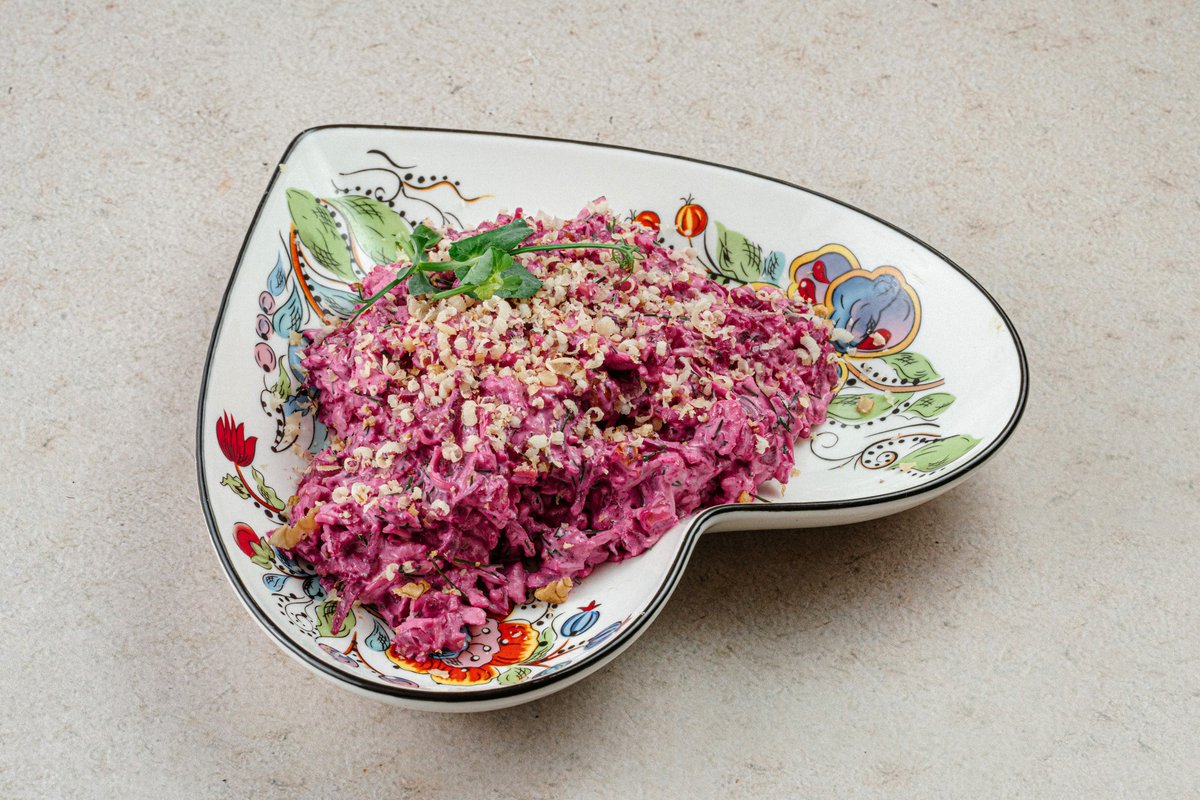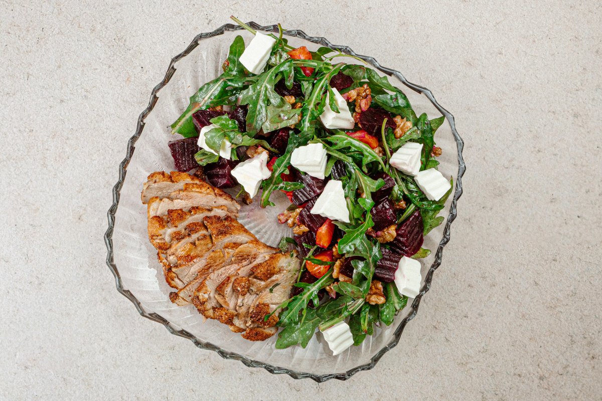 Свекла, руккола, сыр фета, грецкие орехи, филе утки