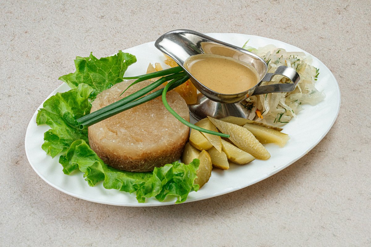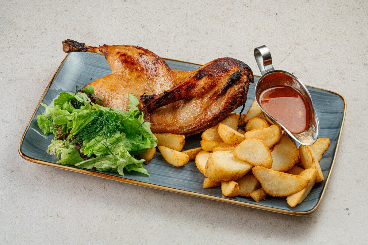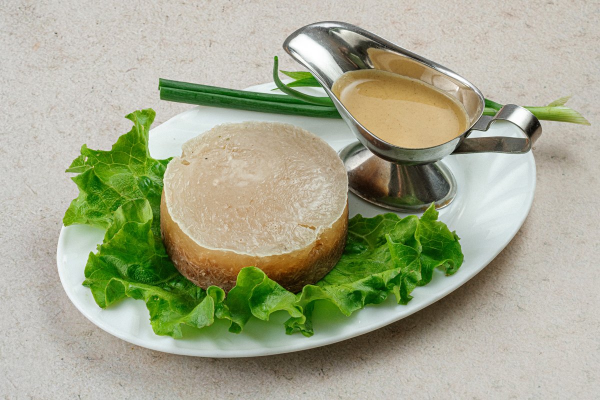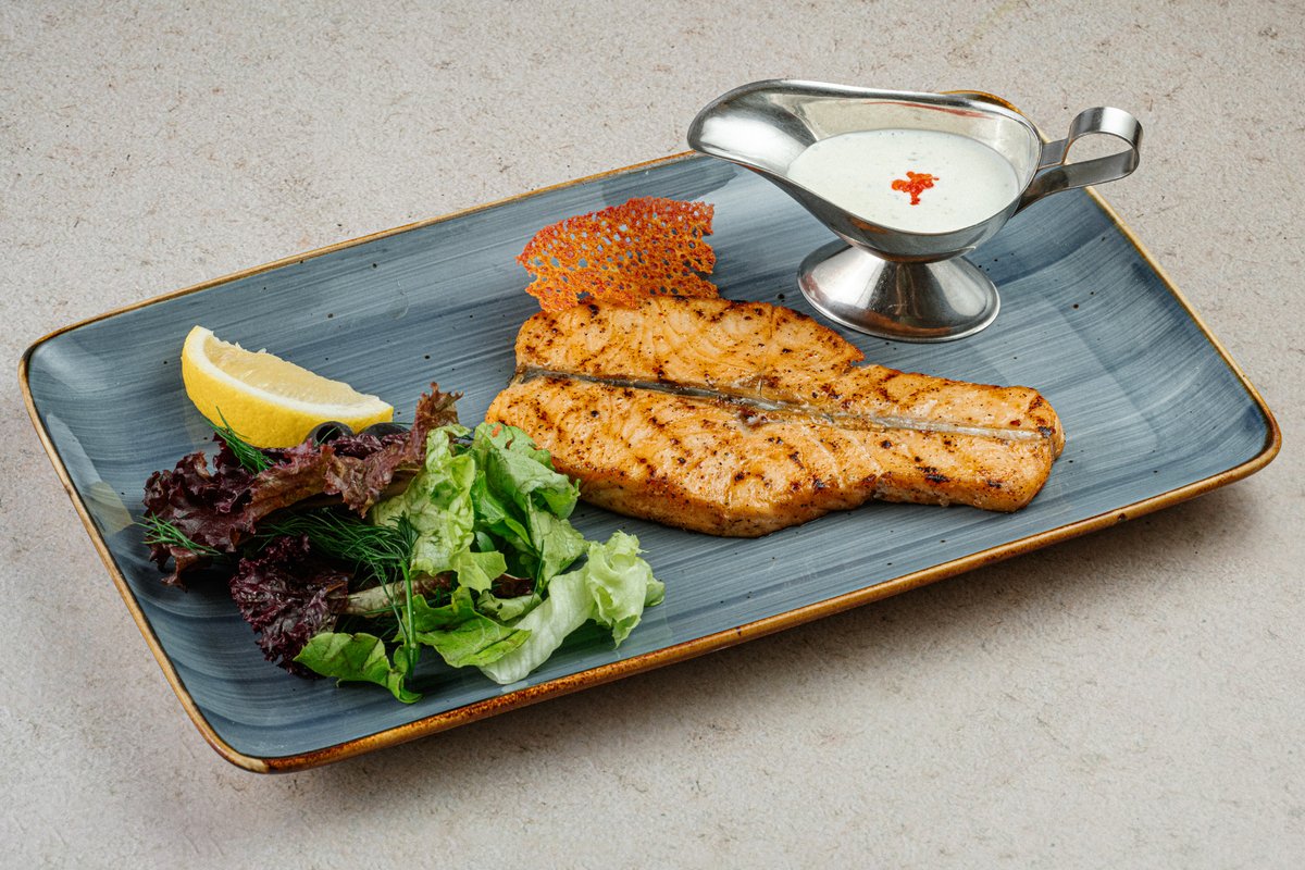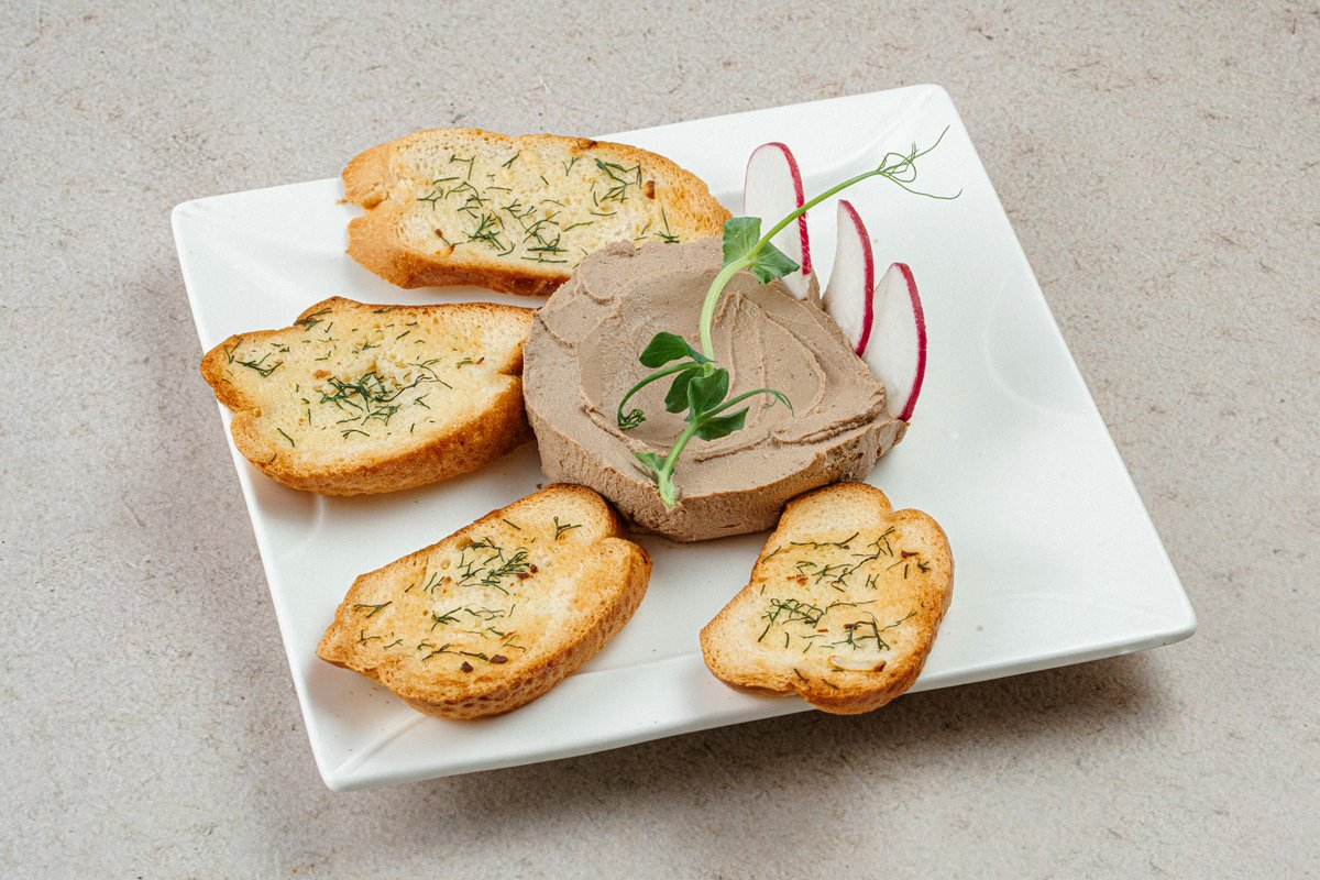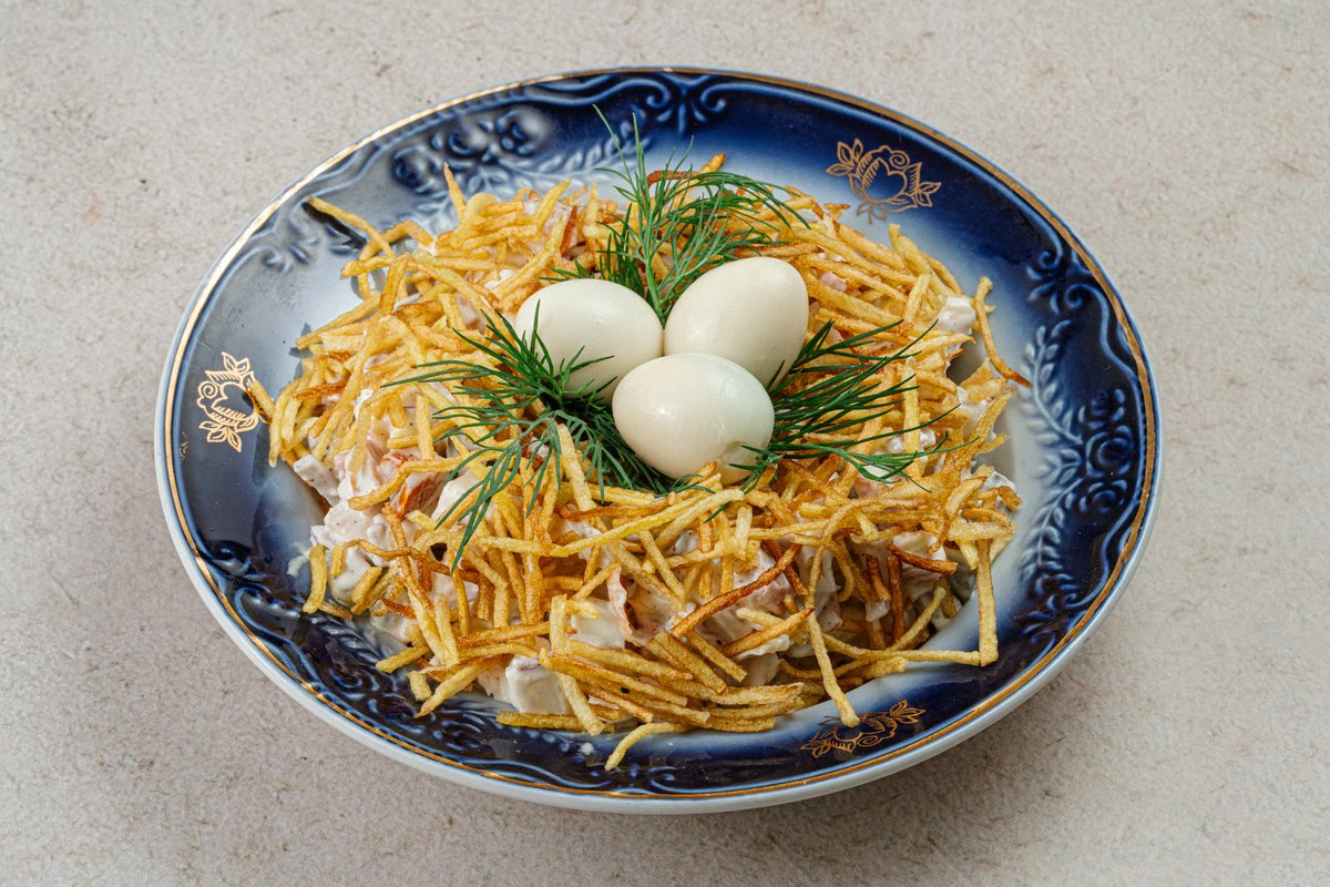 с филе курочки или семги, пряного посола по желанию гостя, дижонская горчица. Декорация: перепелинные яйца, сухарики, сыр пармезан