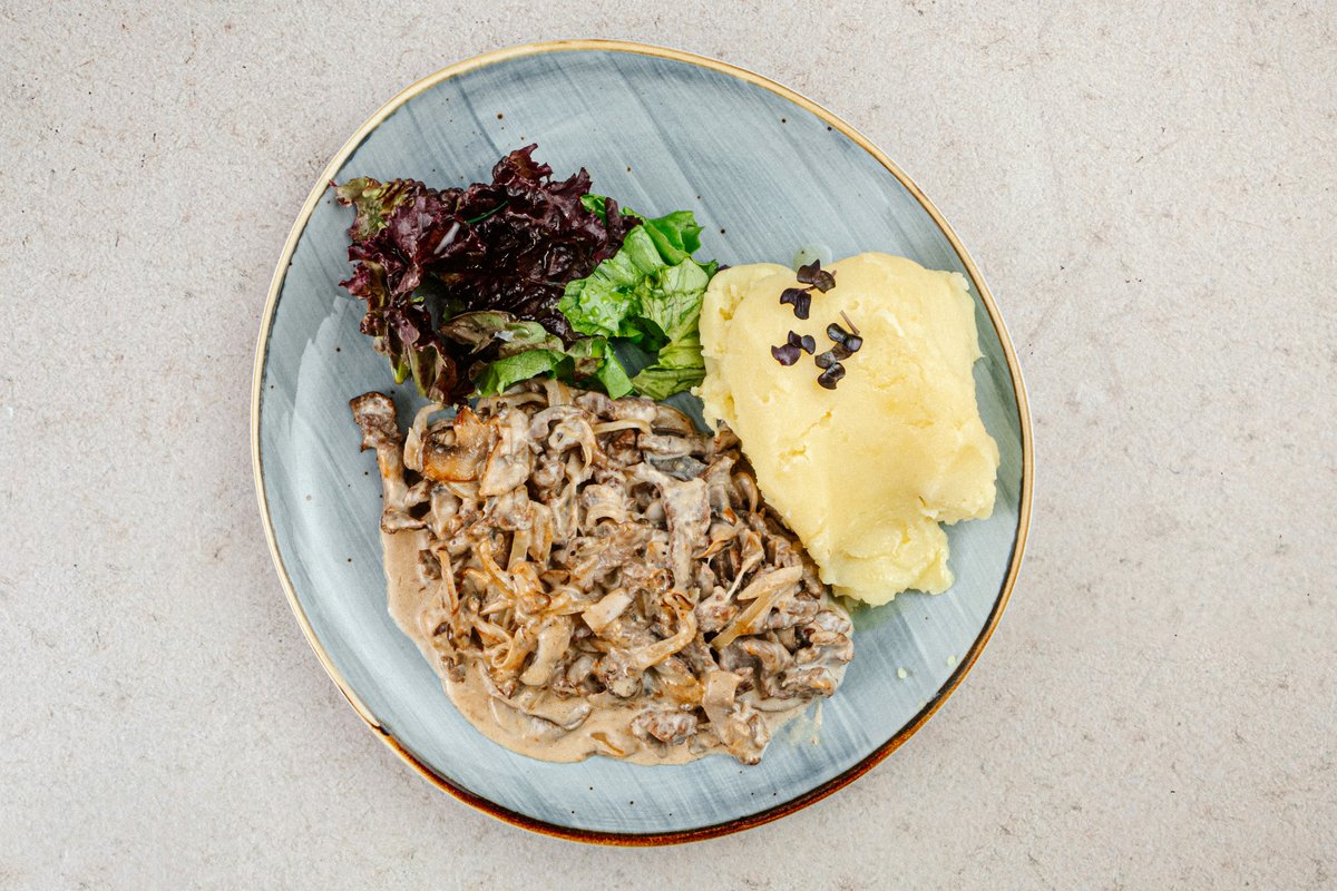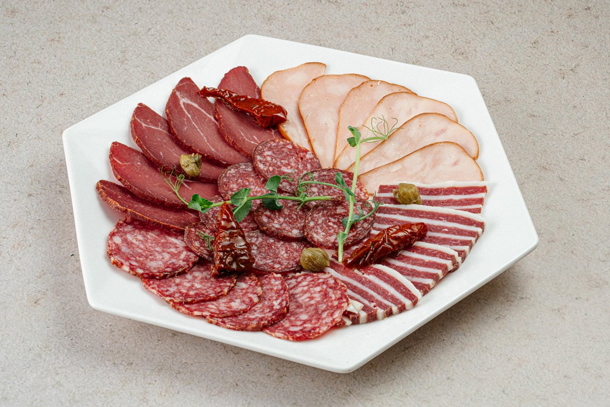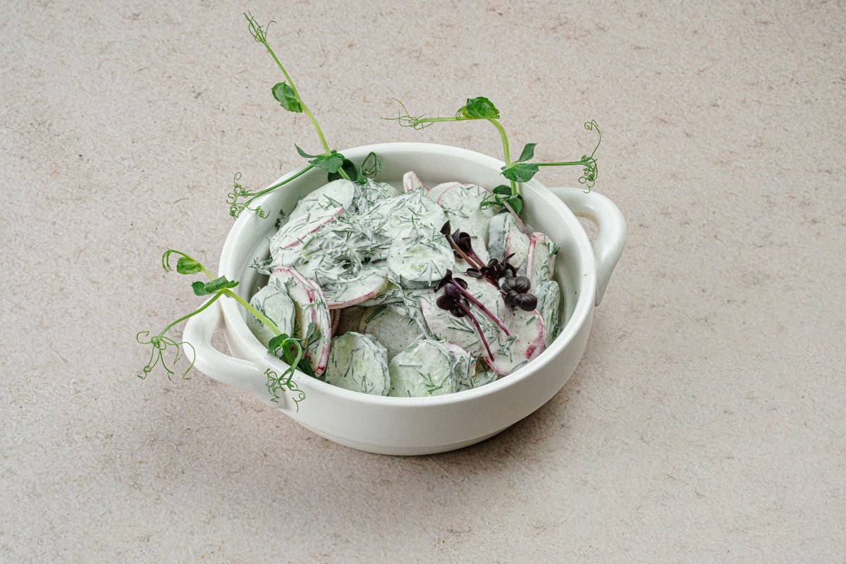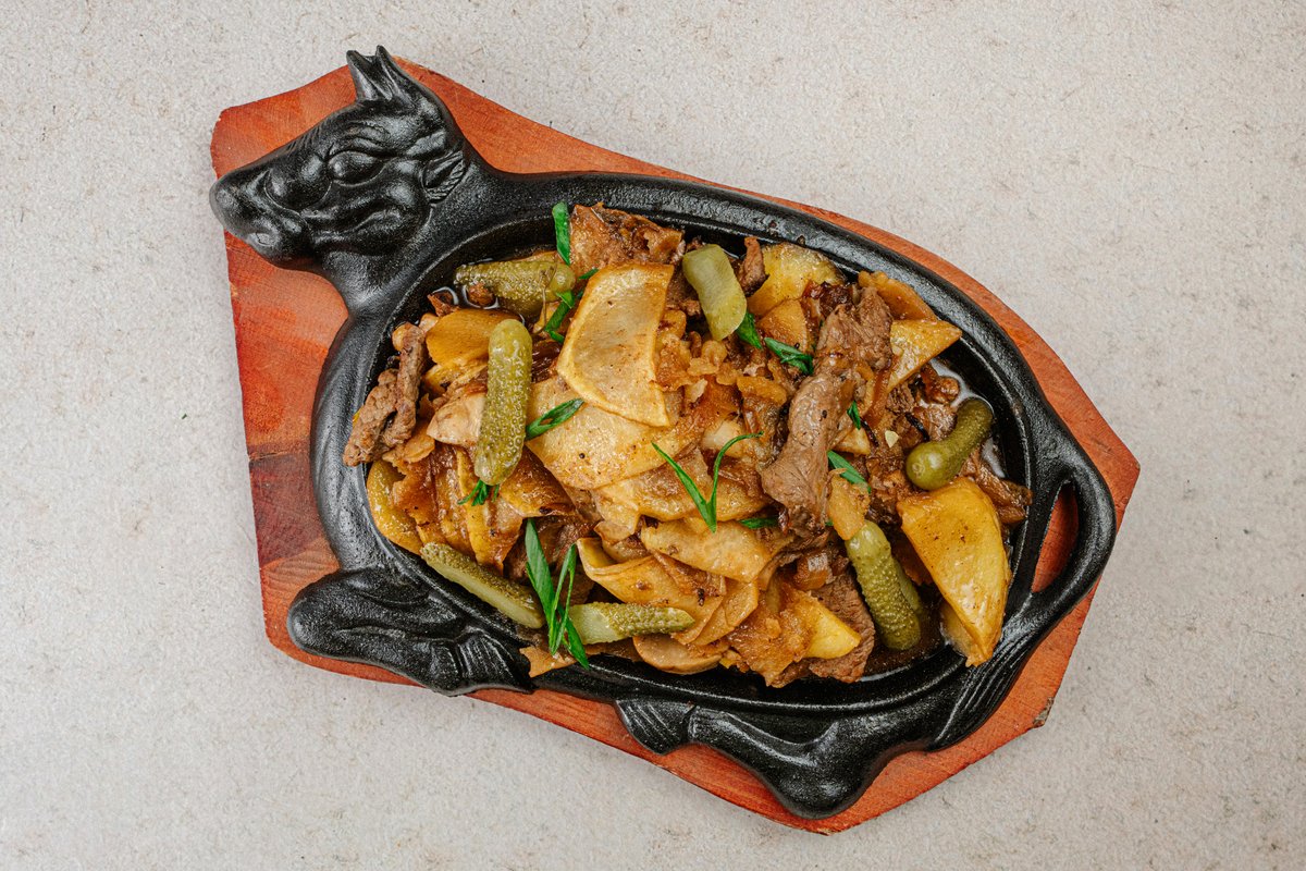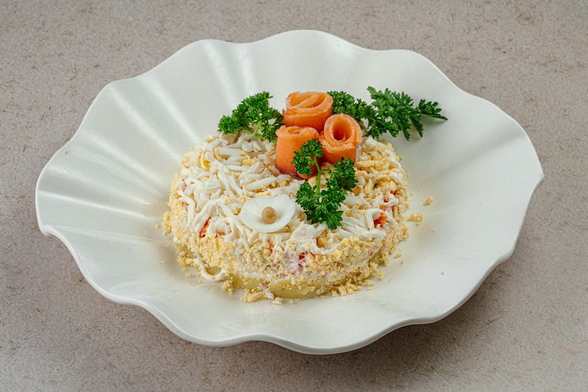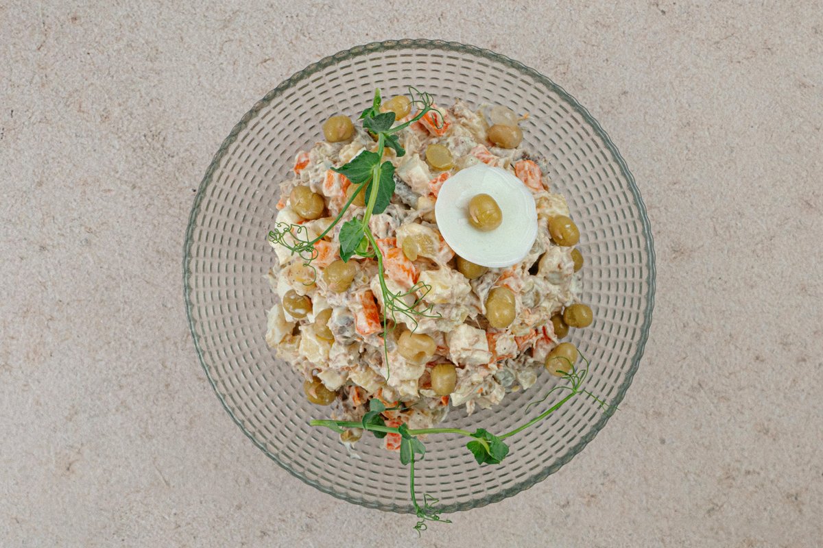 Отварной картофель, отварная говядина, морковь, огурцы маринованные, яйца, горошек, майонез, на выбор: колбаса, мясо