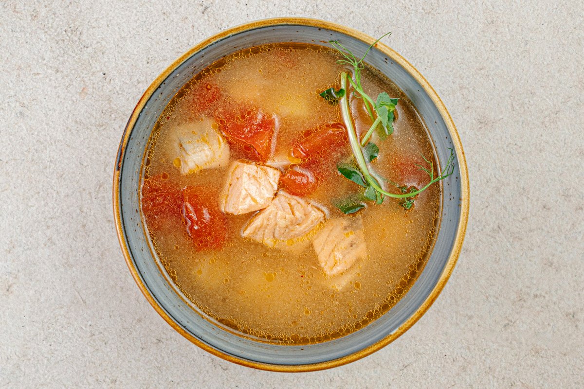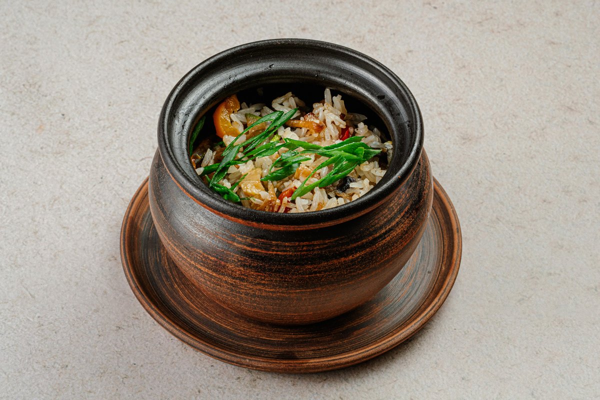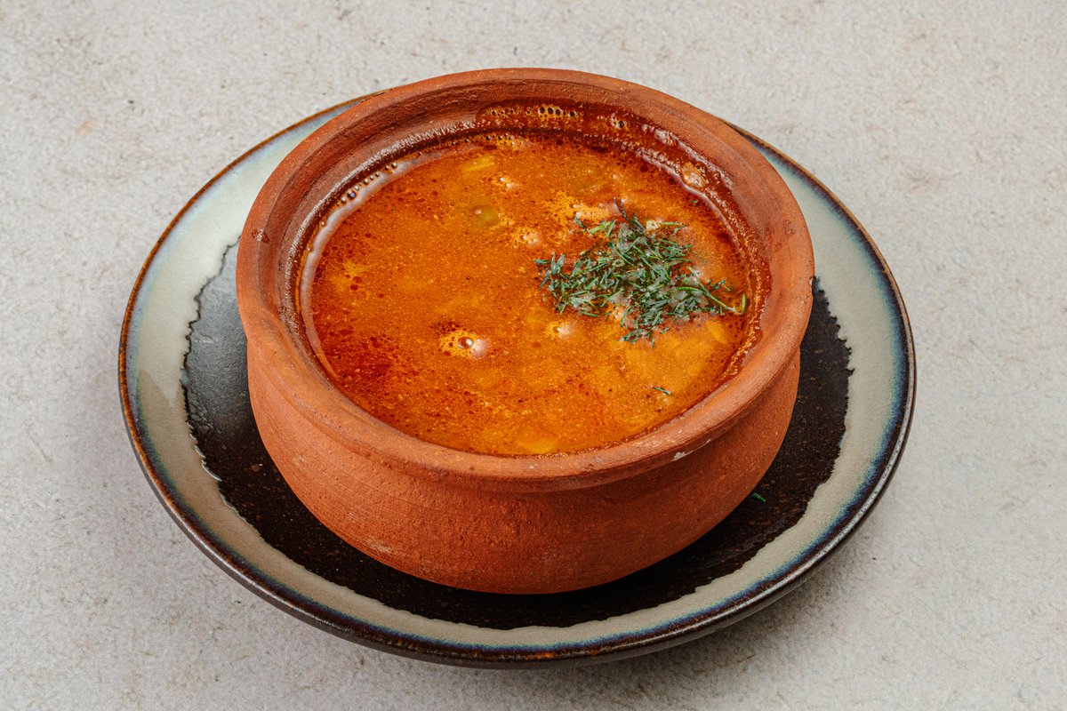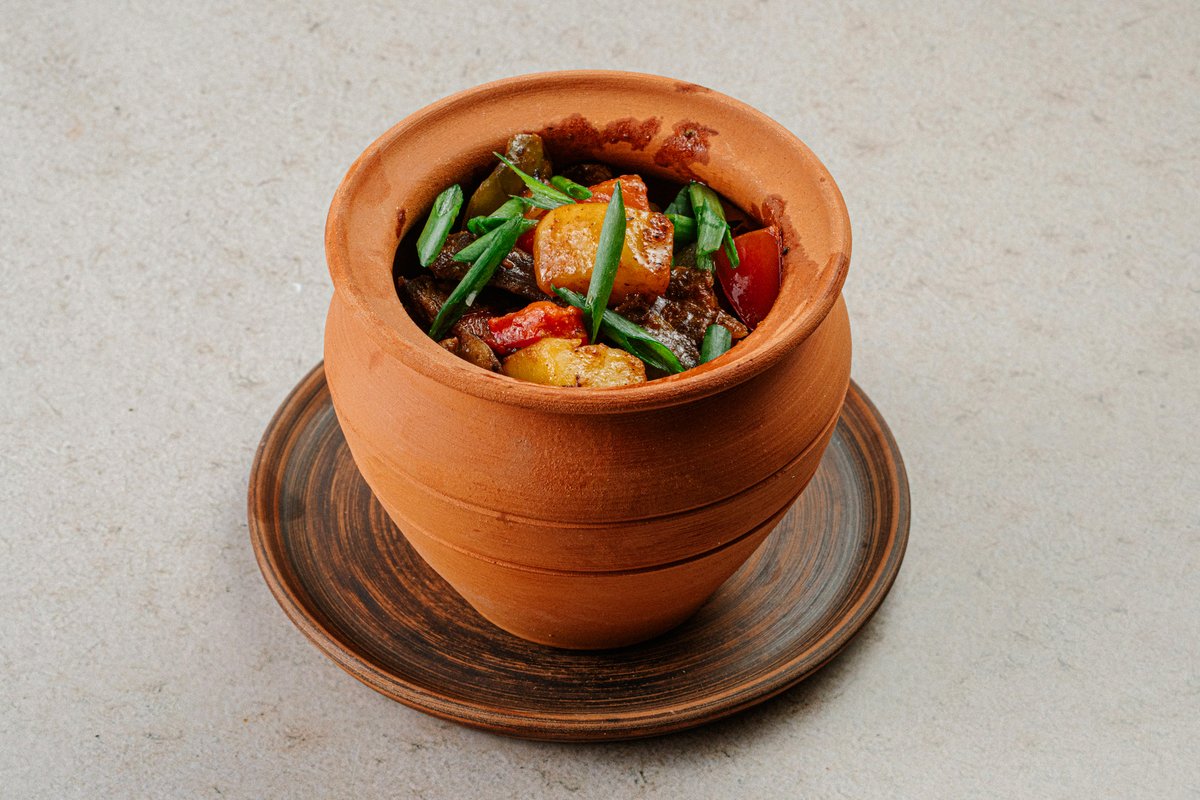 Tr. Мясо ягненка / телятины / домашней курицы, картофель, томаты, перец болгарский, лук репчатый, лаваш, зелень, (блюдо на 4-х)
