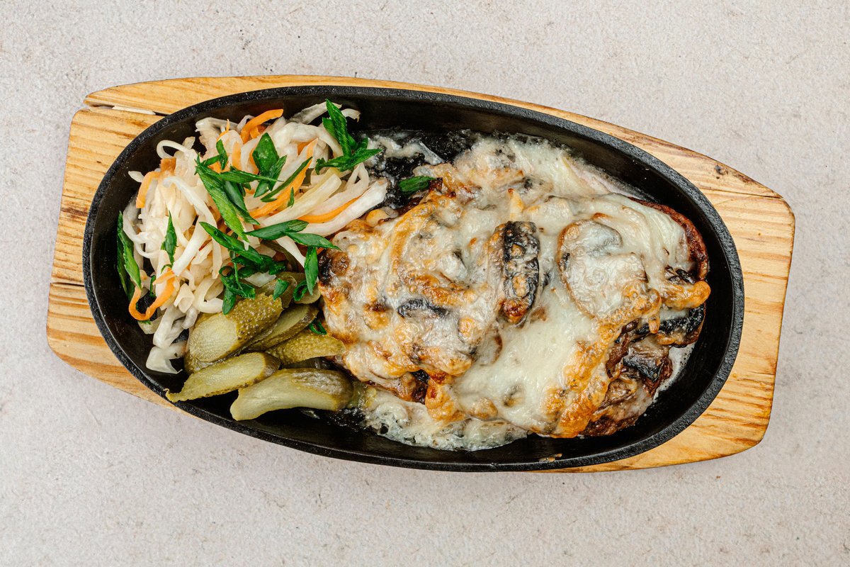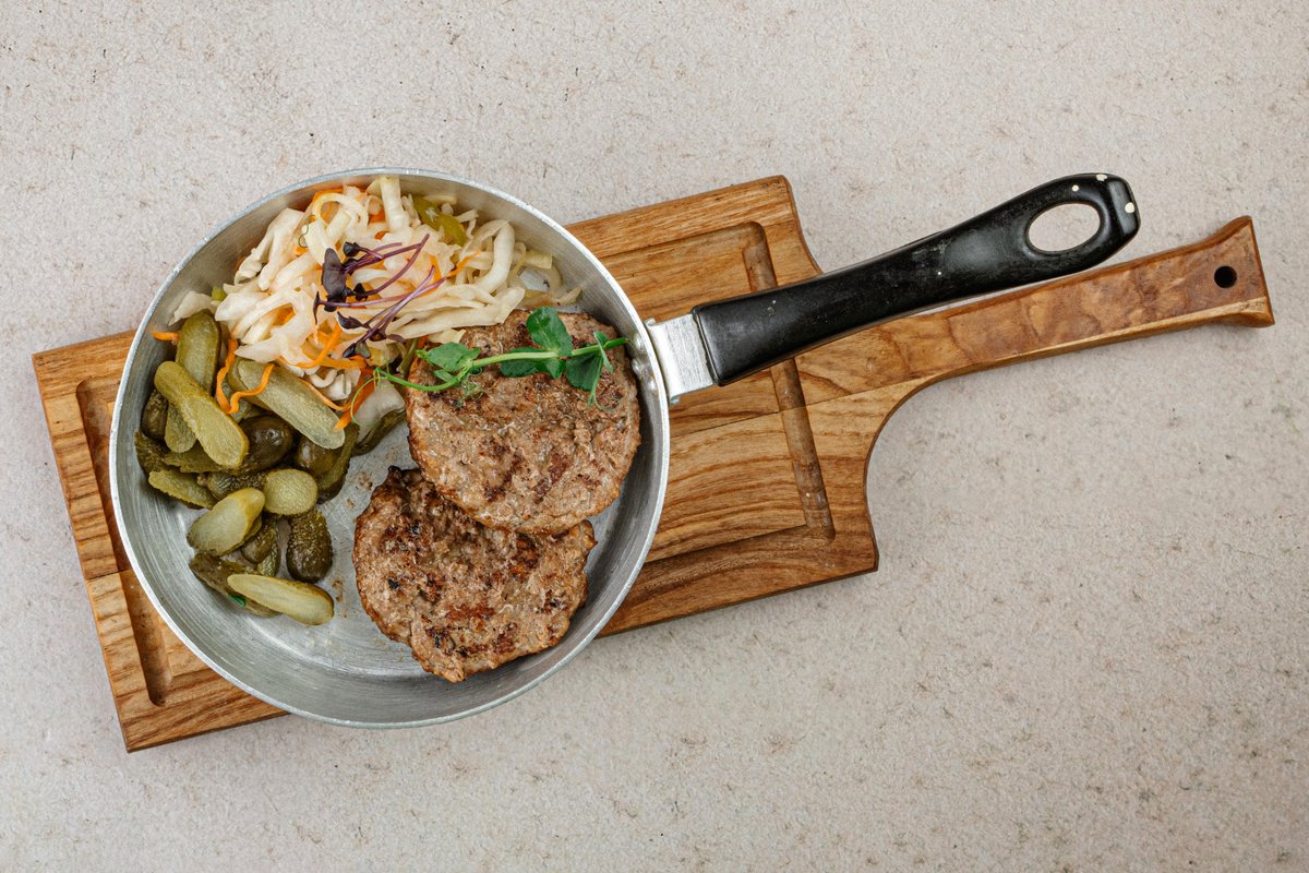 Булочка, сыр чеддер, соус сырный, помидоры, котлета из телятины