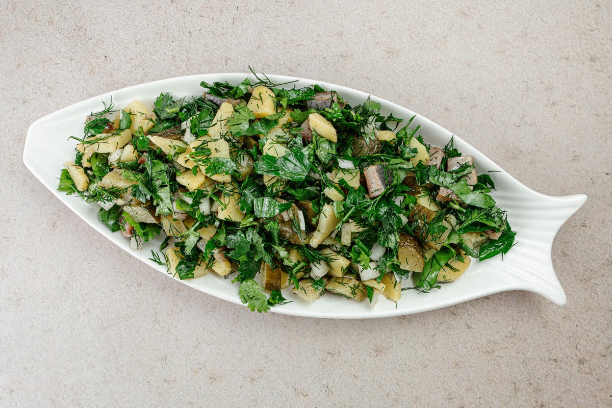 селедка, картошка, соленые огурцы, квашенная капуста,зелень, масло растительное