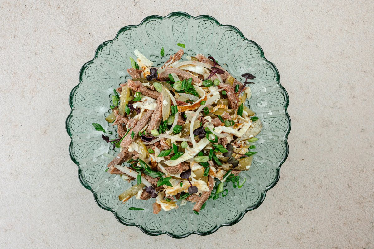 Мясо говядины, соленые огурцы, яйца, лук, майонез, масло растительное