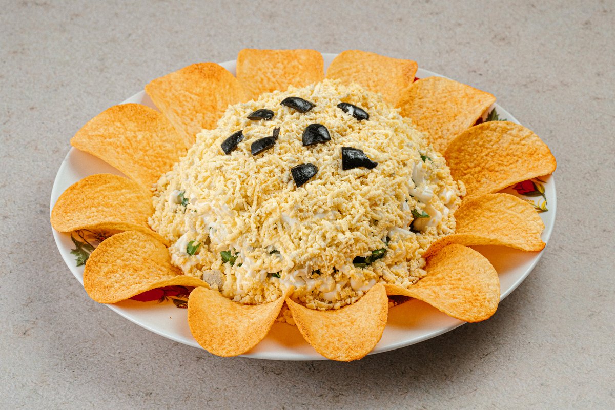 Чипсы, курица копченая, шампиньоны, яйца, сыр, майонез, маслины